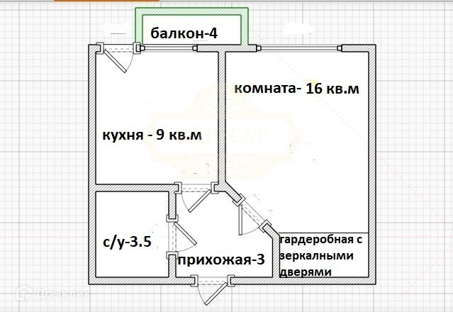 Однокомнатная квартира 31 кв.м + балкон - 4 кв.м. Комната – 16 кв.м, кухня - 9 кв.м, санузел совмещённый.
