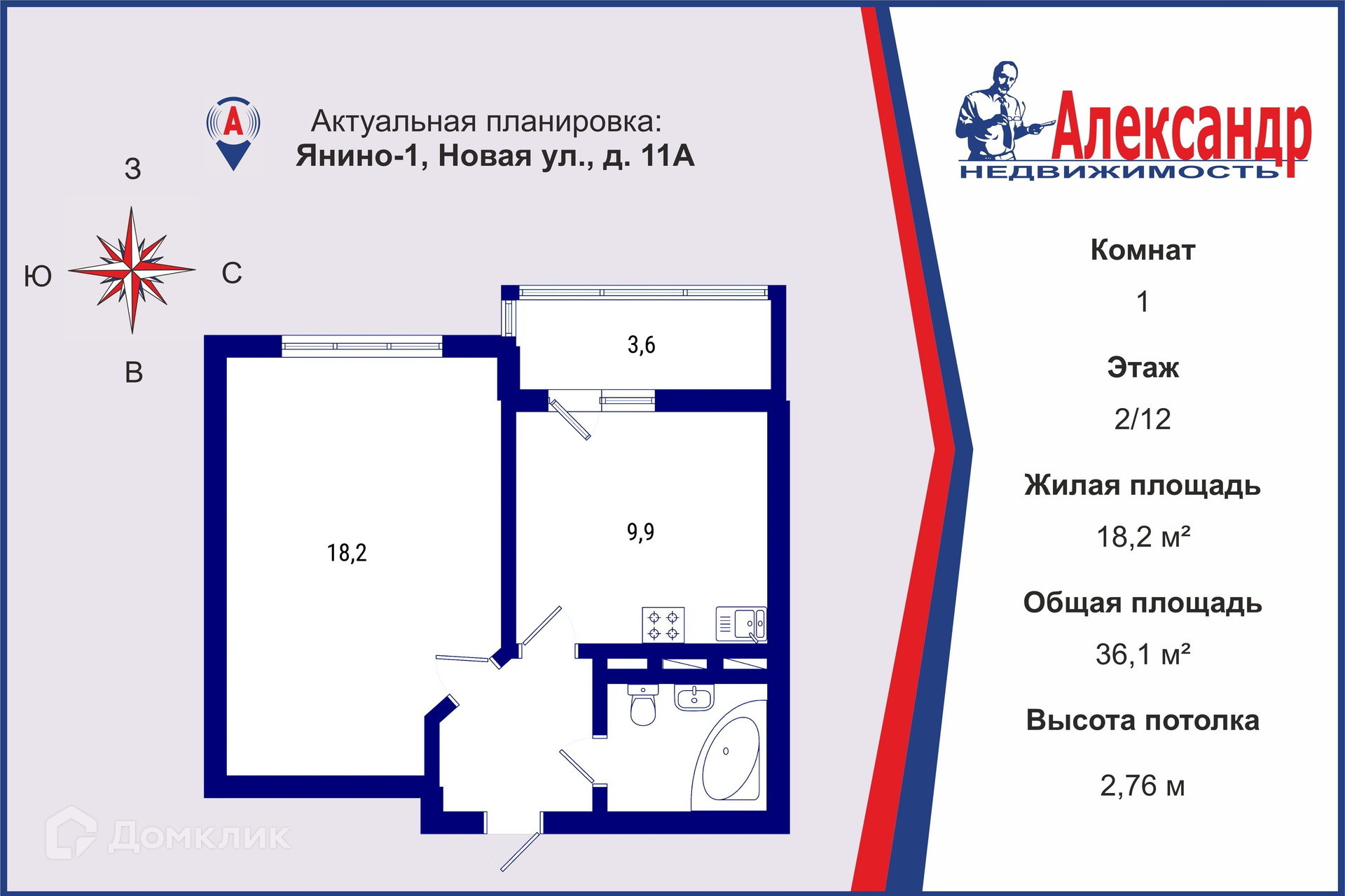 Общая площадь 36.1 м2