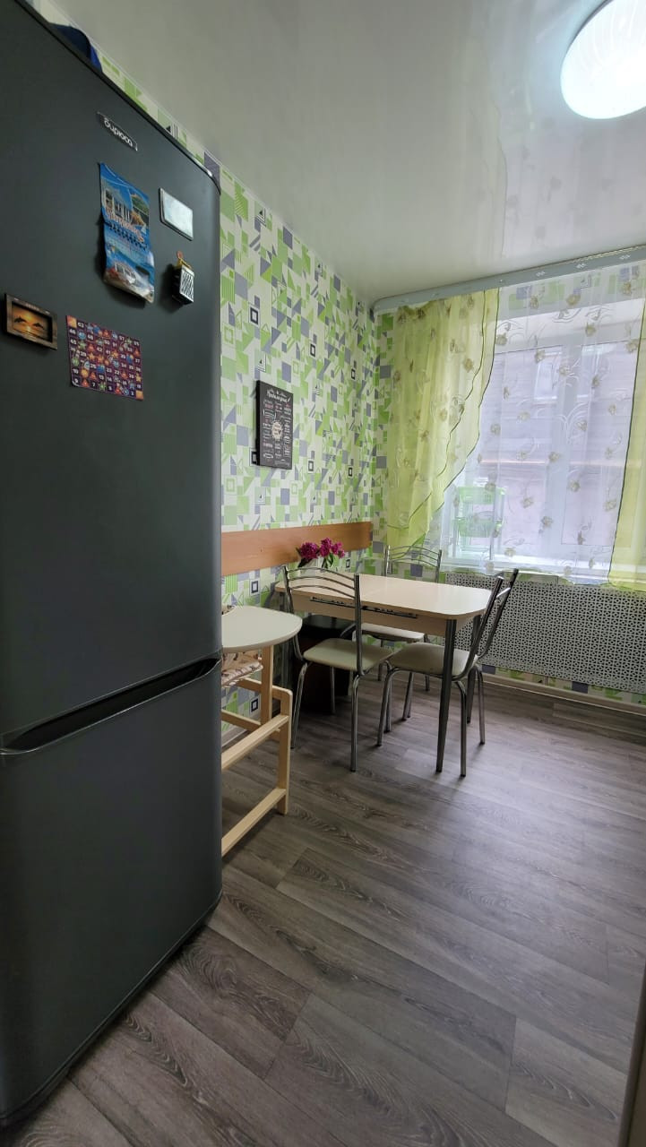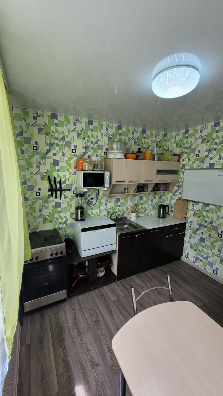 Мебелированна только кухня: гарнитур, стол, стулья, холодильник, плита, морозилка, микроволновка