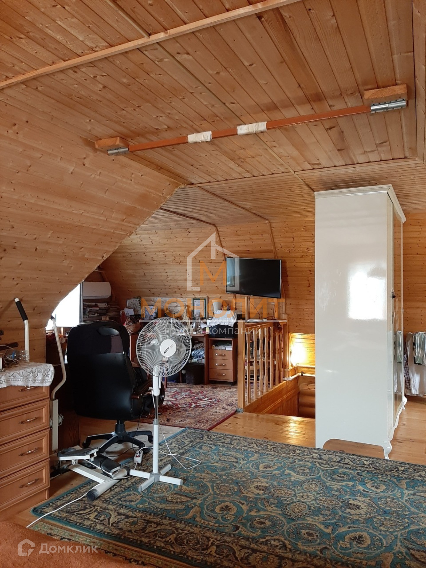 Мансарда-46,4 кв.м., свободной планировки, условно разделена на три спальных места на которую ведёт очень удобная деревянная лестница.