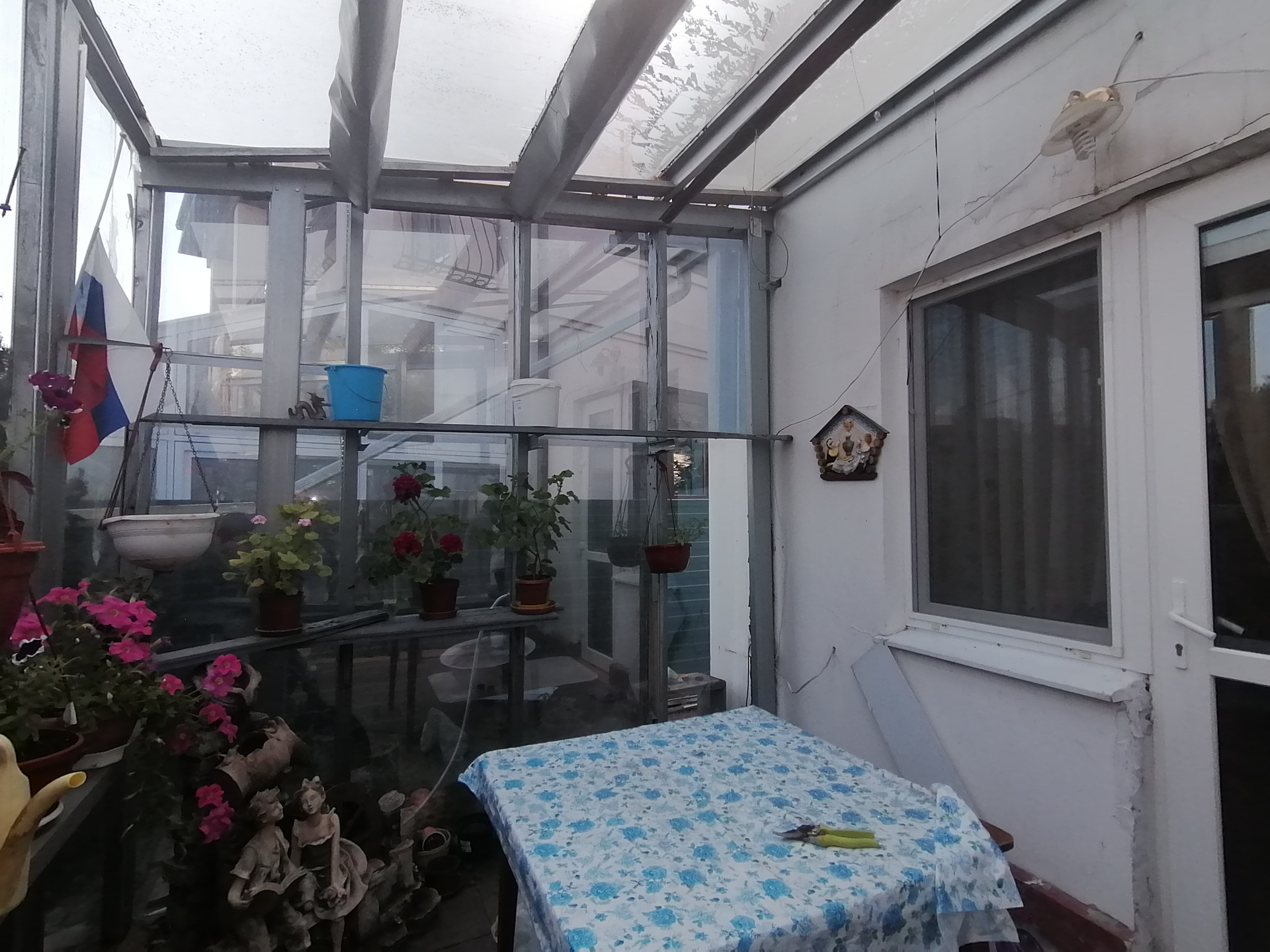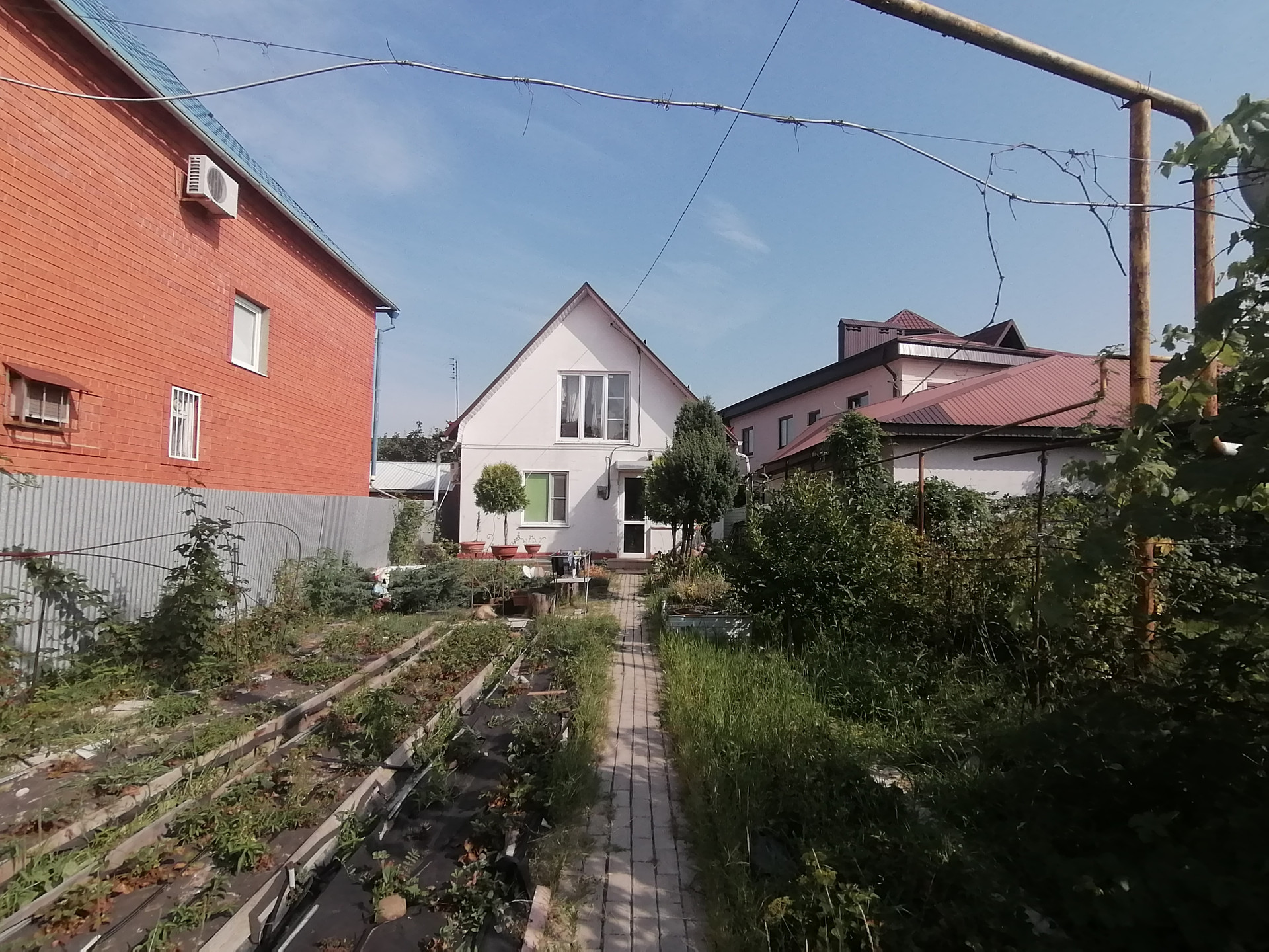 Во дворе перед домом декоративные насаждения и виноград, за домом теплица, огород, небольшой сад.