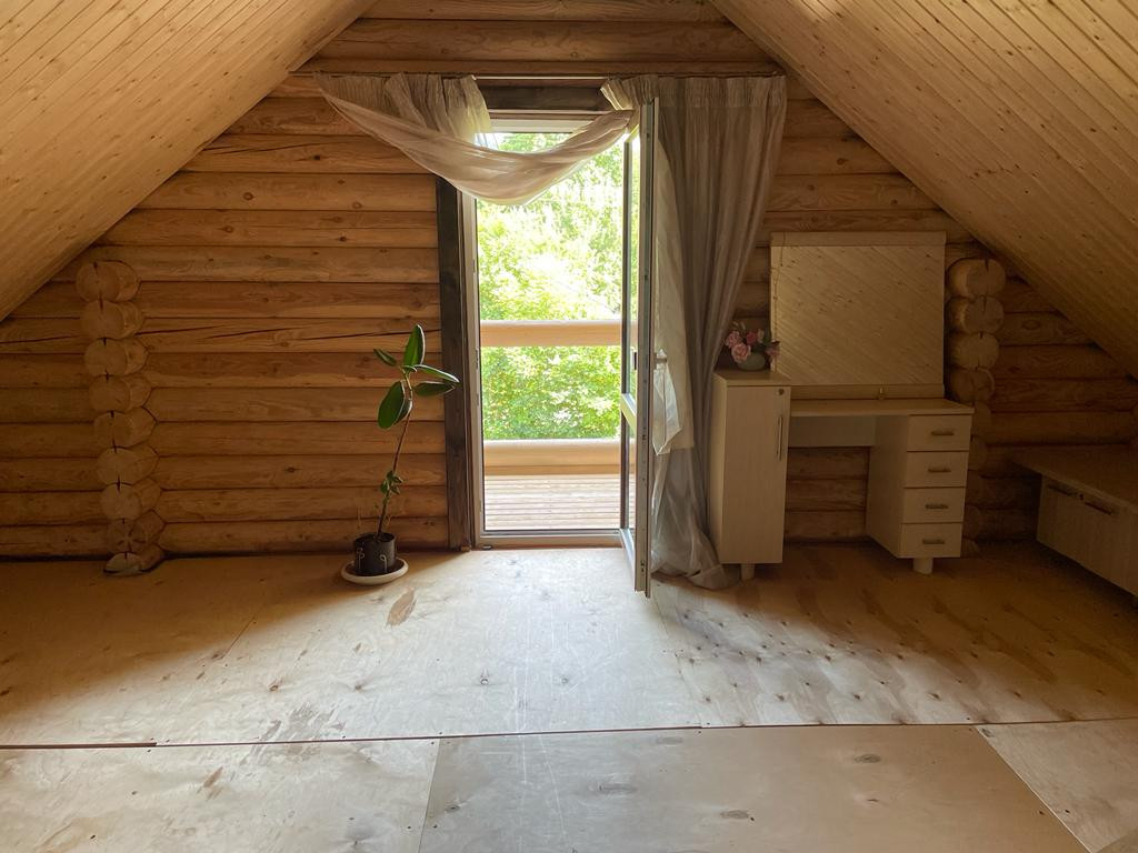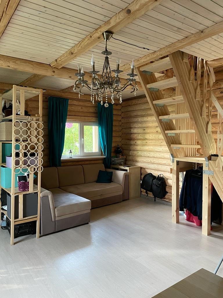 Размер дома 6x9м, жилая площадь 70 м2. Дом построен из массива архангельской сосны (самый дорогой северный, очень плотный лес). Два этажа, второй этаж - мансардный (поднят на 6 венцов).