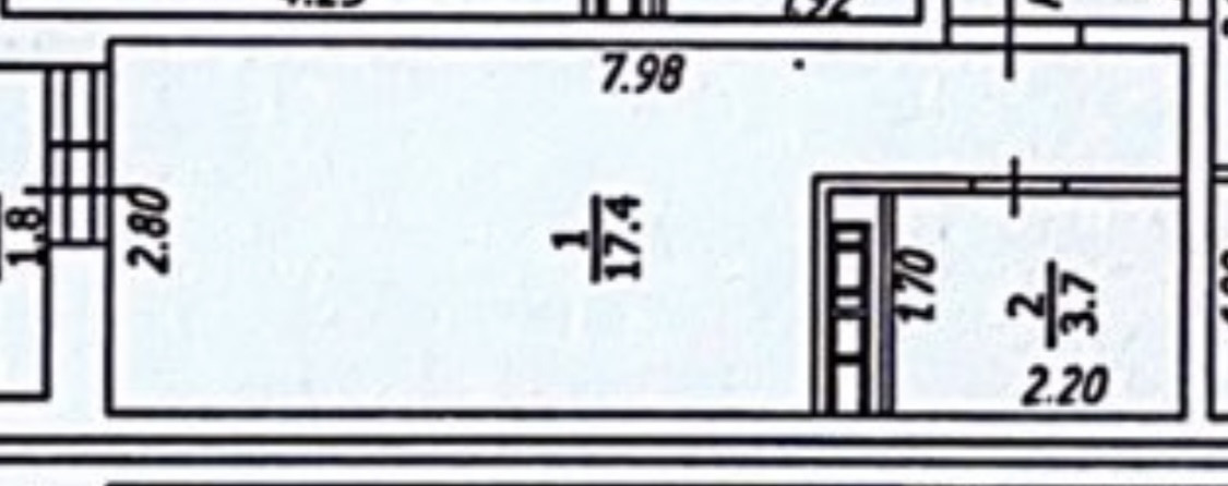 Жилая 17,4 м2, лоджия1,8 м2, санузел совмещен 3,7 м2.