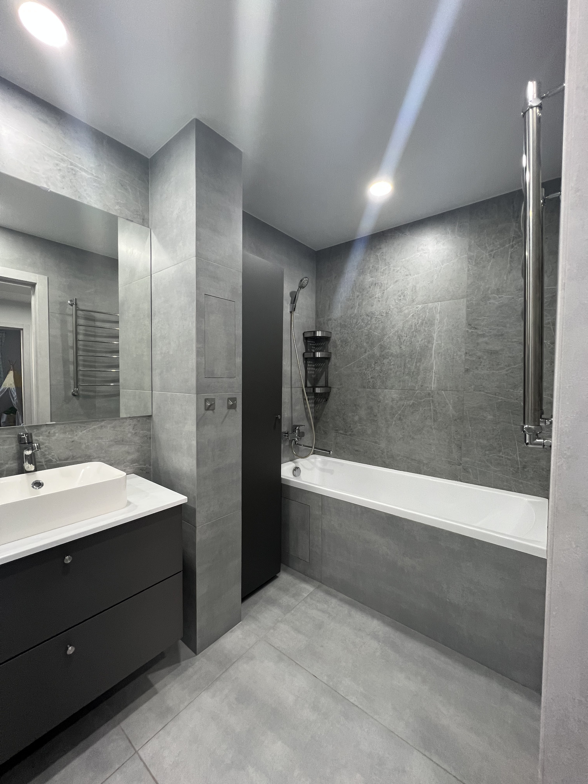 .Идеально ровные стены и пол .Использовались только Качественные и экологичные материалы,стены окрашены в светлые тона , на полу кварц винил .Теплые полы в ванной , гостиной на балконе .В прихожей, на балконе, кухне и ванной уложен крупноформатный керамогранит .