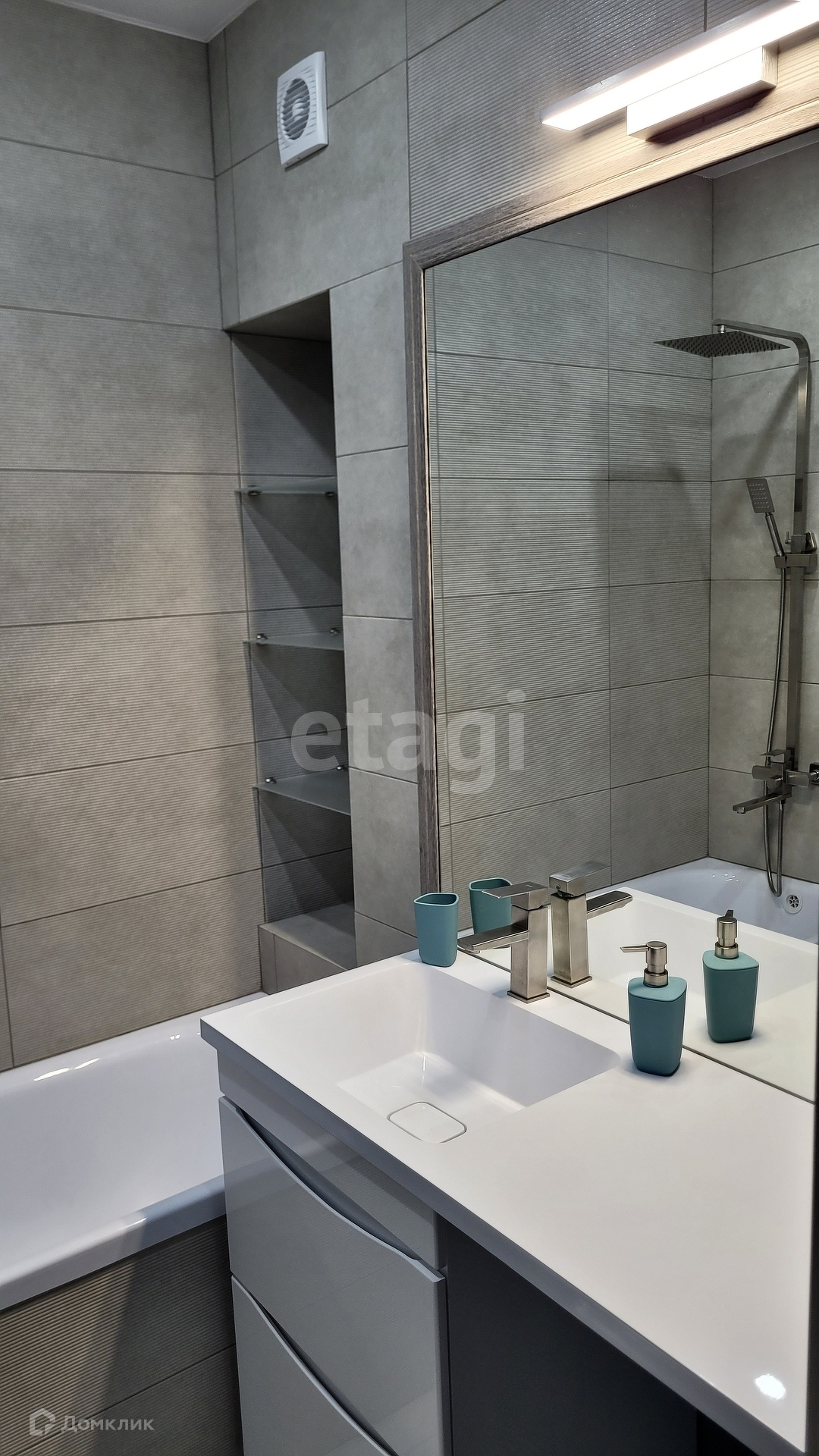 Установлена полноценная новая кухня по индивидуальным размерам в минималистичном стиле «лофт» (фассады кухни выполнены в пленке «Soft Touch» с системой открывания дверок «Push-to-Open» и доводчиками), встроена варочная панель на 4 конфорки и новая вытяжка. Несмотря на маленькую площадь санузел сделан максимально эргономично, установлена полноценная ванна, качественные душевые смеситель с тропич