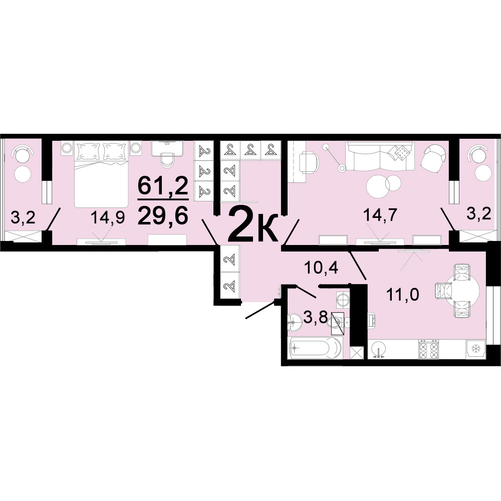 Жилая площадь 29.6 м2