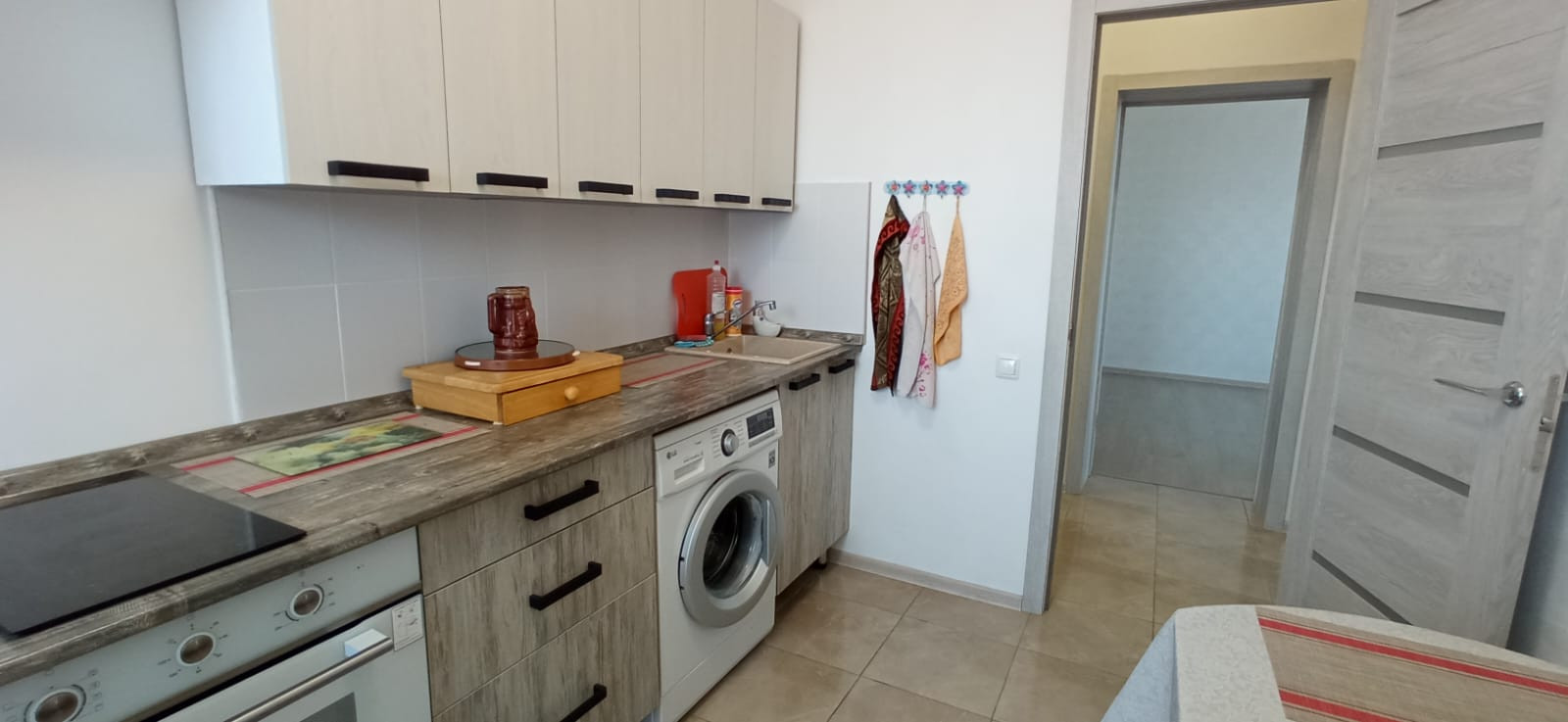 Общая площадь квартиры 58,1 м2, жилая —38,3, кухни — 9,0 м2.  Кухня с качественной встроенной техникой, холодильником.