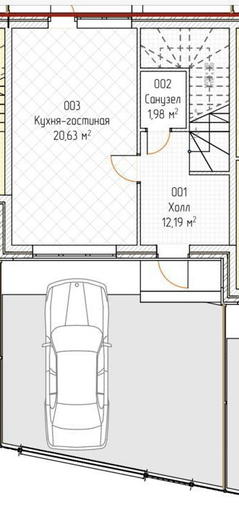 На первом этаже расположены прихожая, кухня-столовая, санузел.