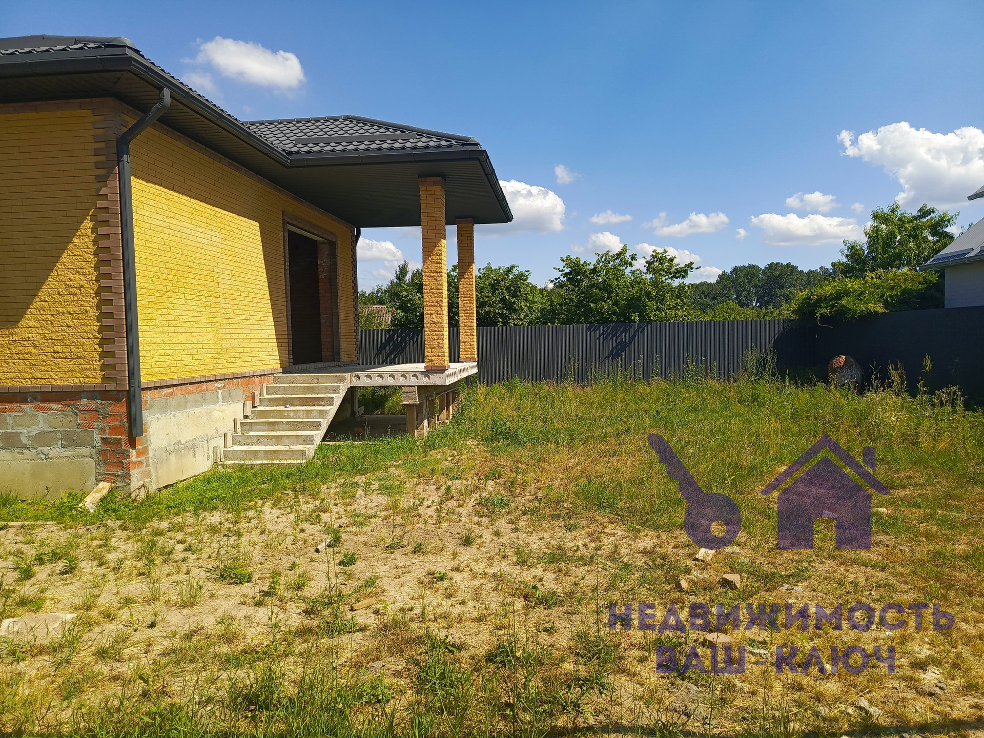 В стоимость входит облагораживание: тротуарная плитка, забор и откатные ворота.