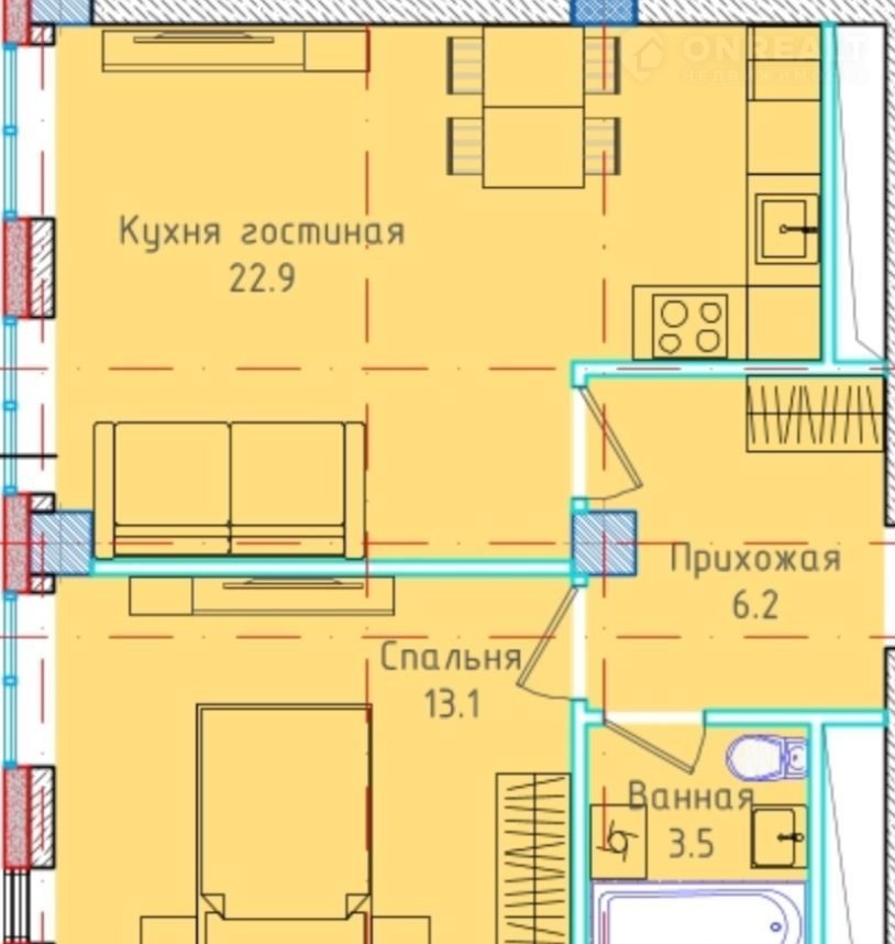 Площадь кухни 22.9 м2