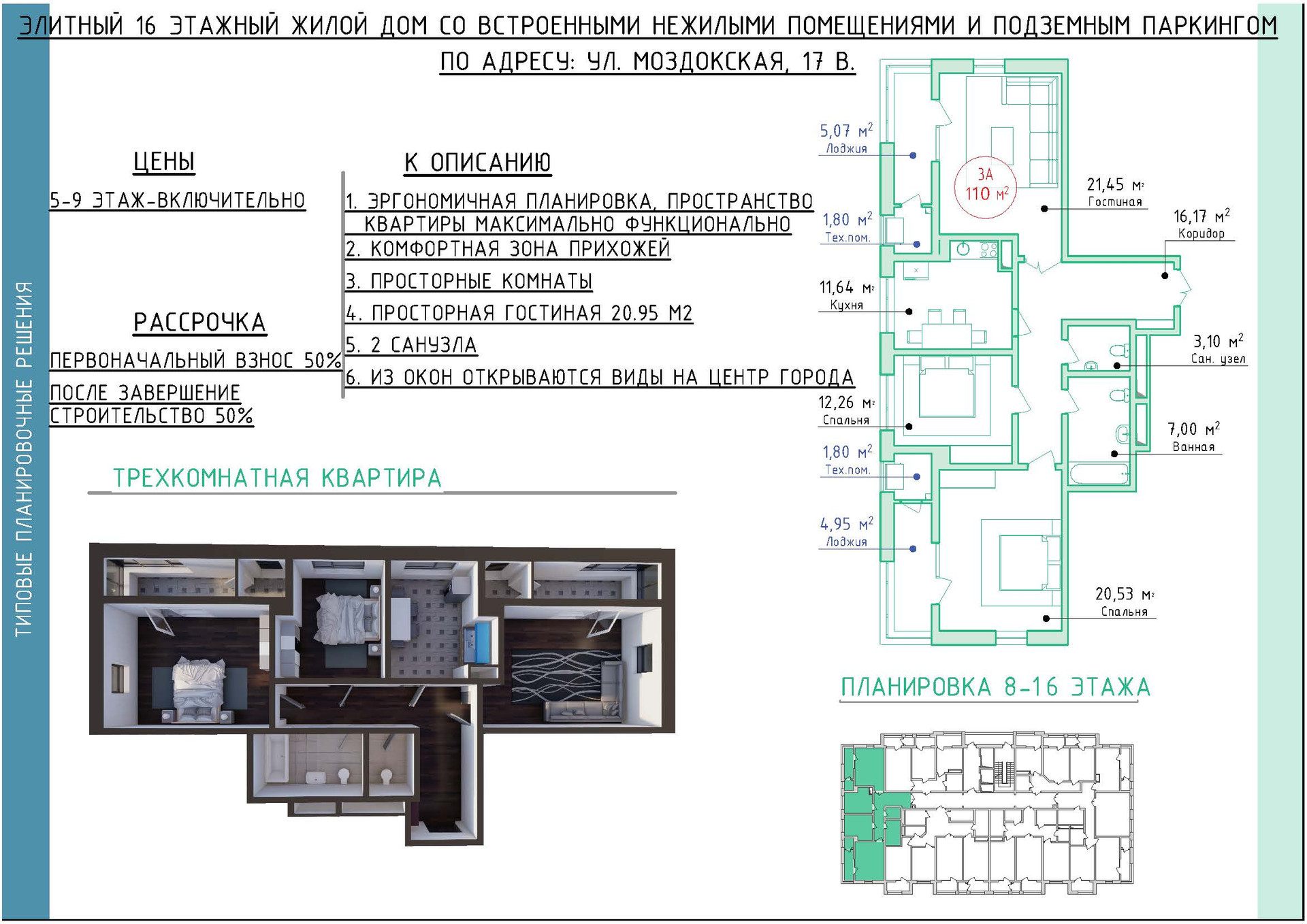 Элитный 16 этажный дом со встроенными нежилыми помещениями и подземным паркингом по адресу: ул. Моздокская, 17 в.