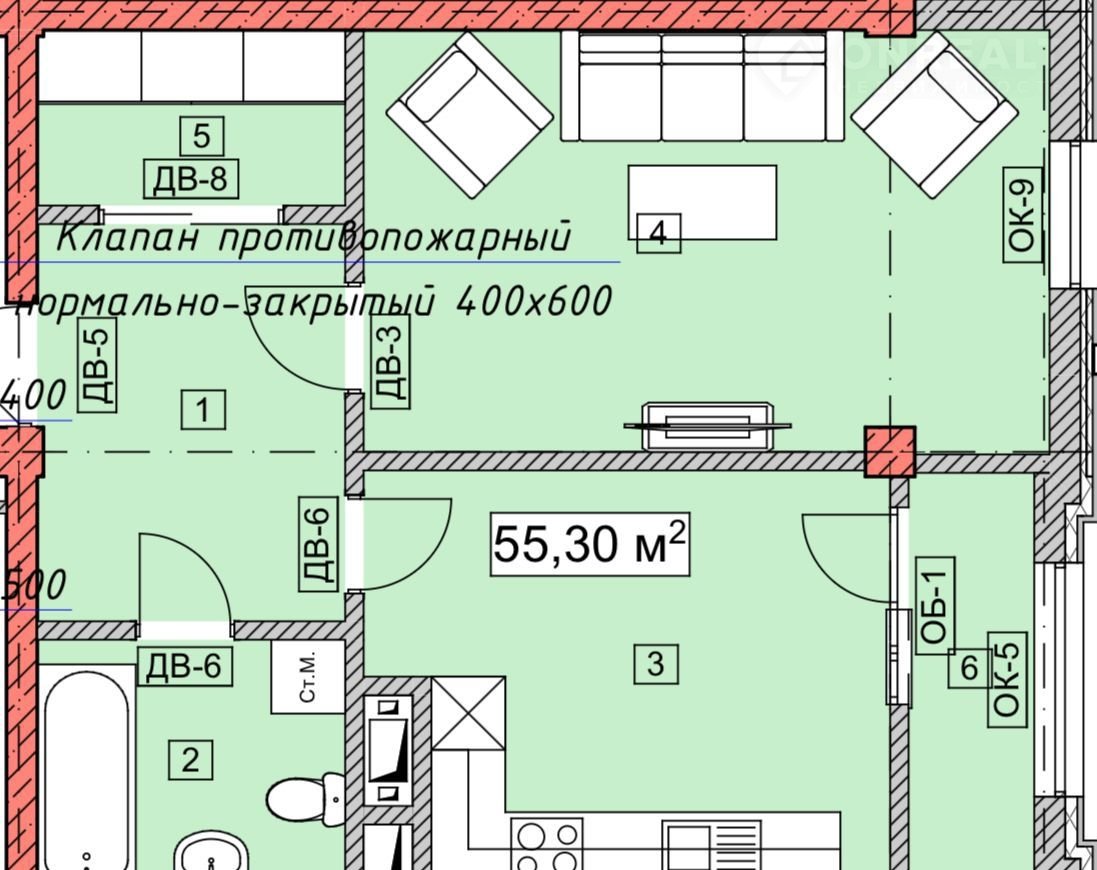 Общая площадь 55.3 м2