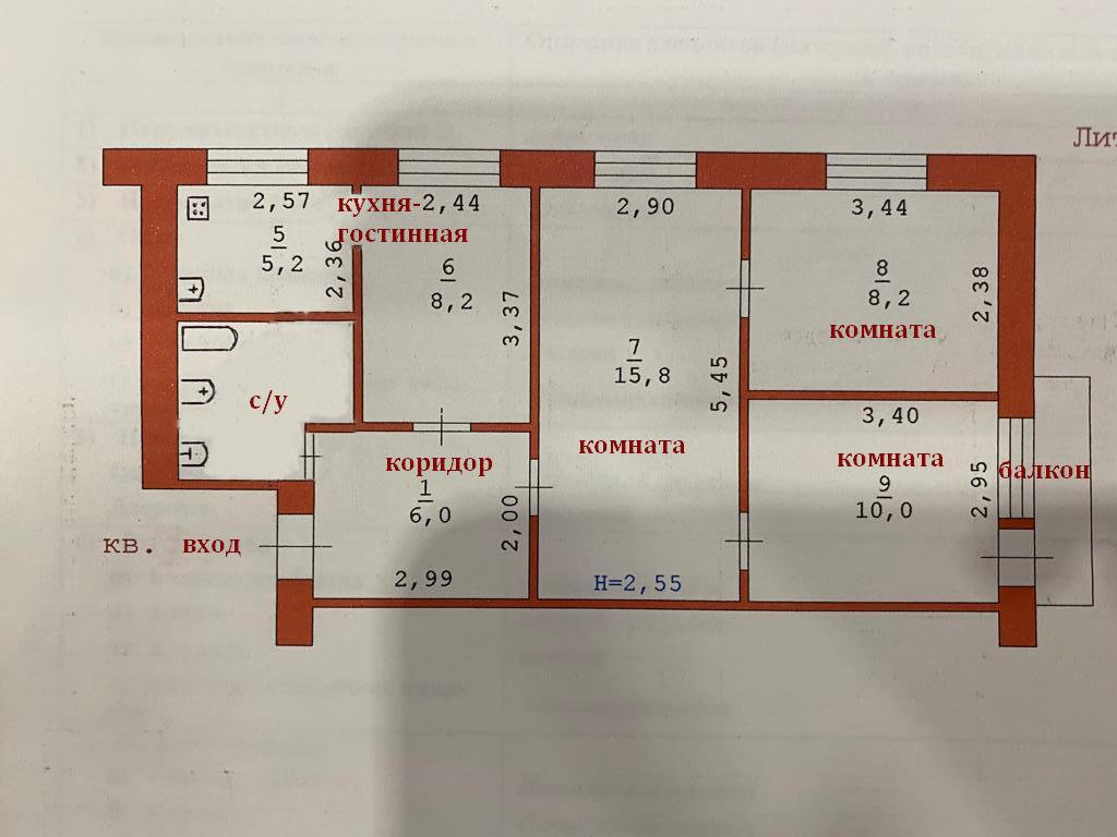 Общая площадь (без балкона) = 57,8 м2