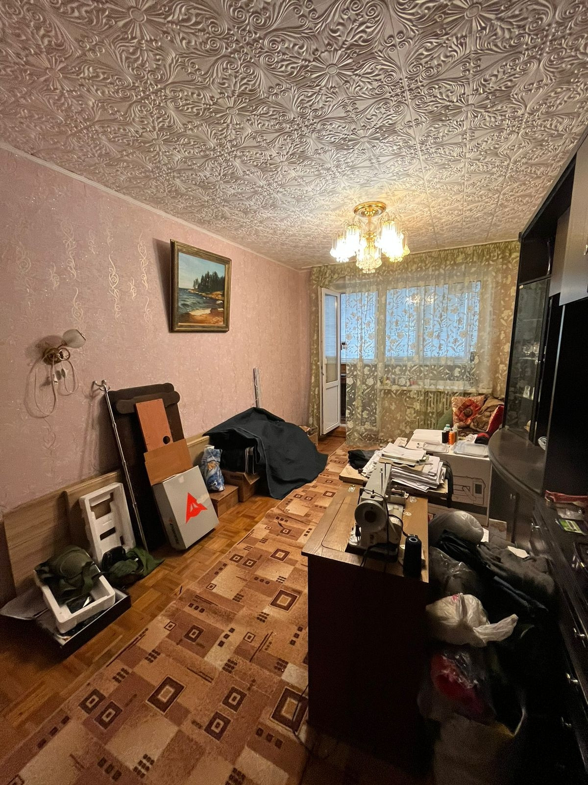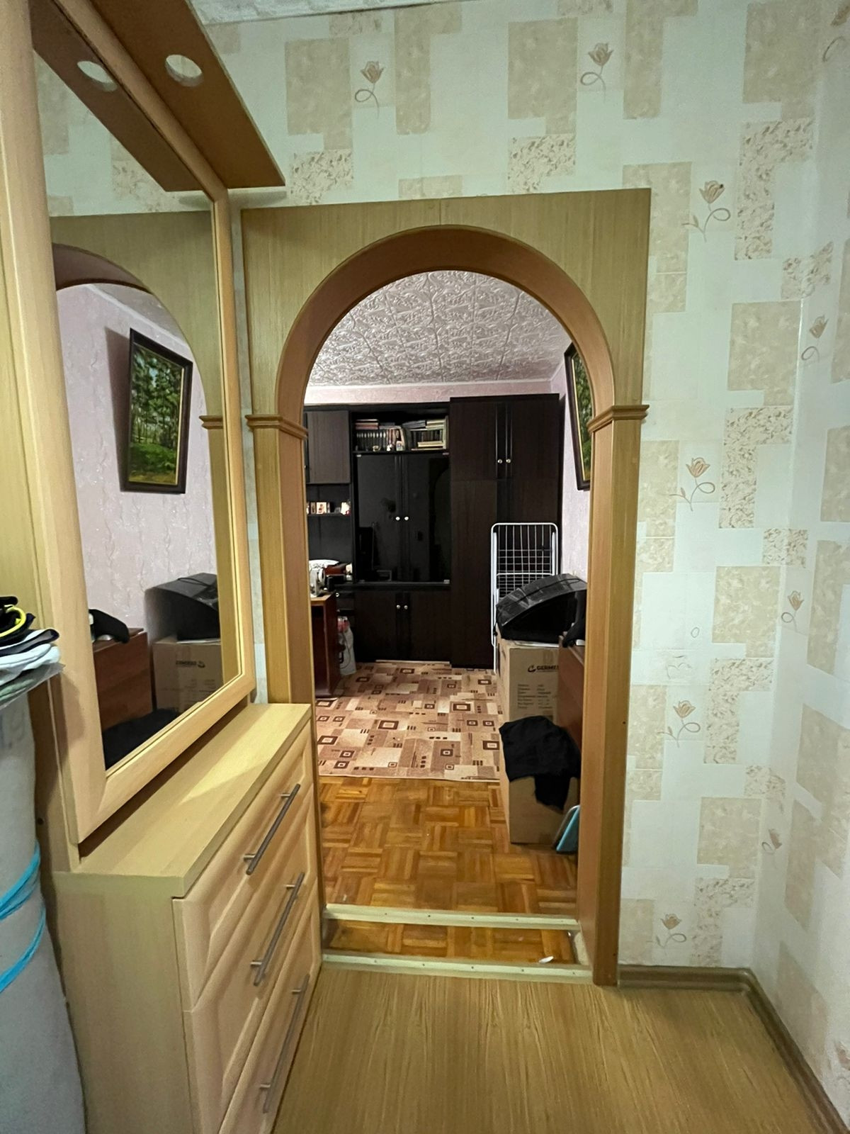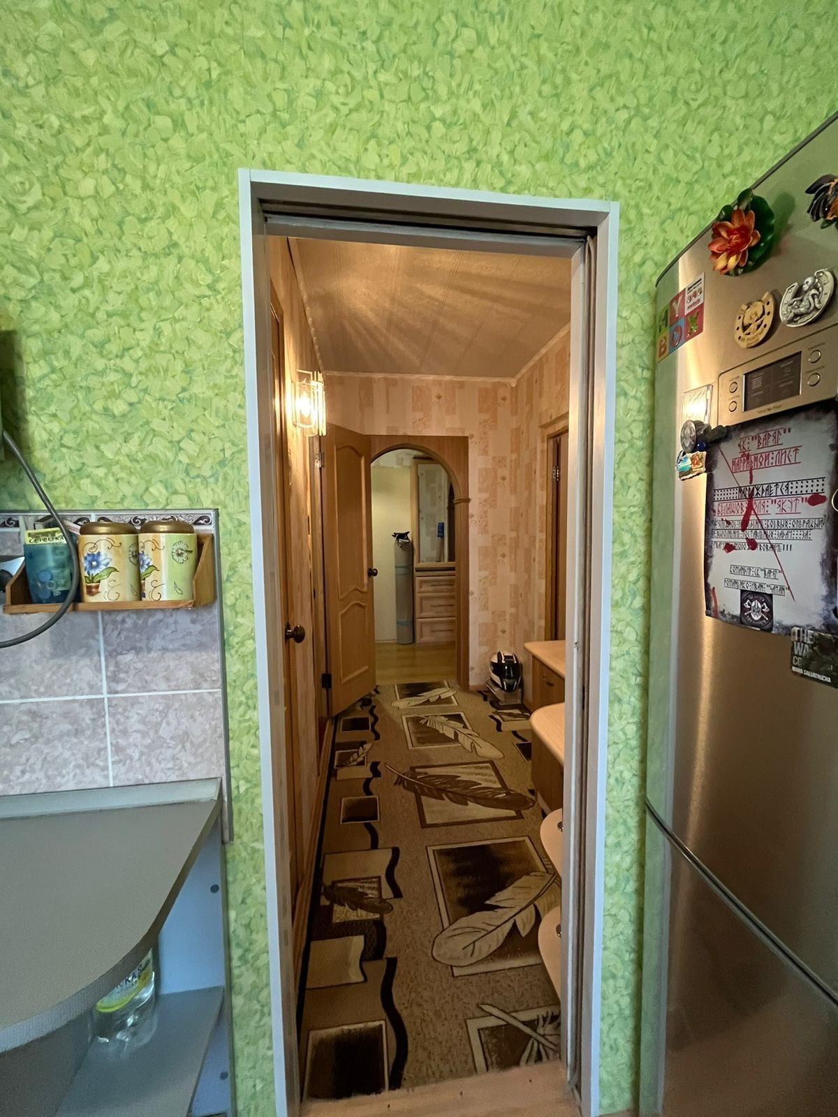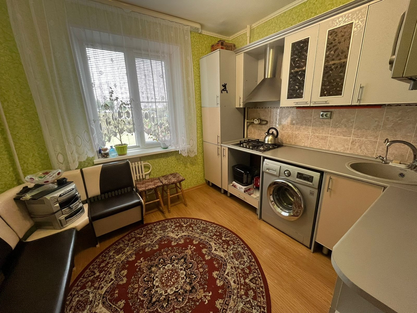 В кухонную зону проведён отдельный провод с большим запасом по нагрузке. В квартире остаётся кухонный гарнитур с уголком, стенка, компьютерный стол.