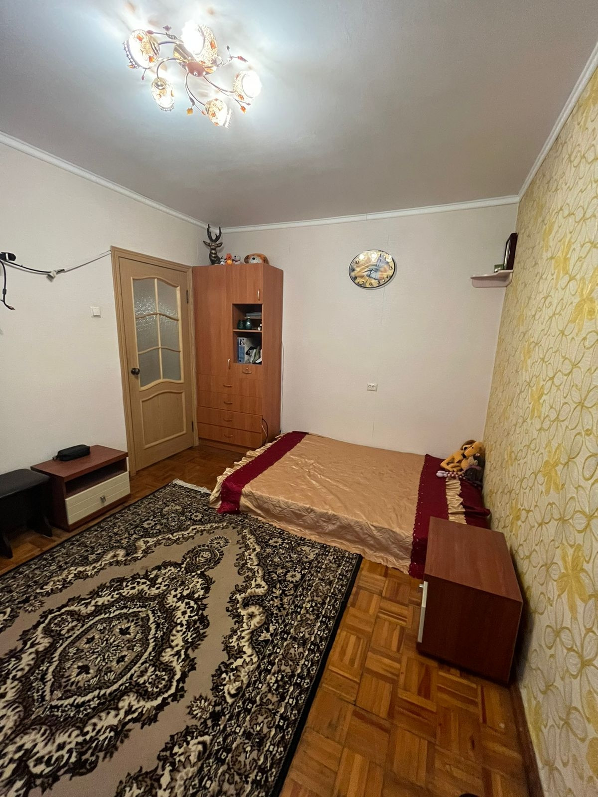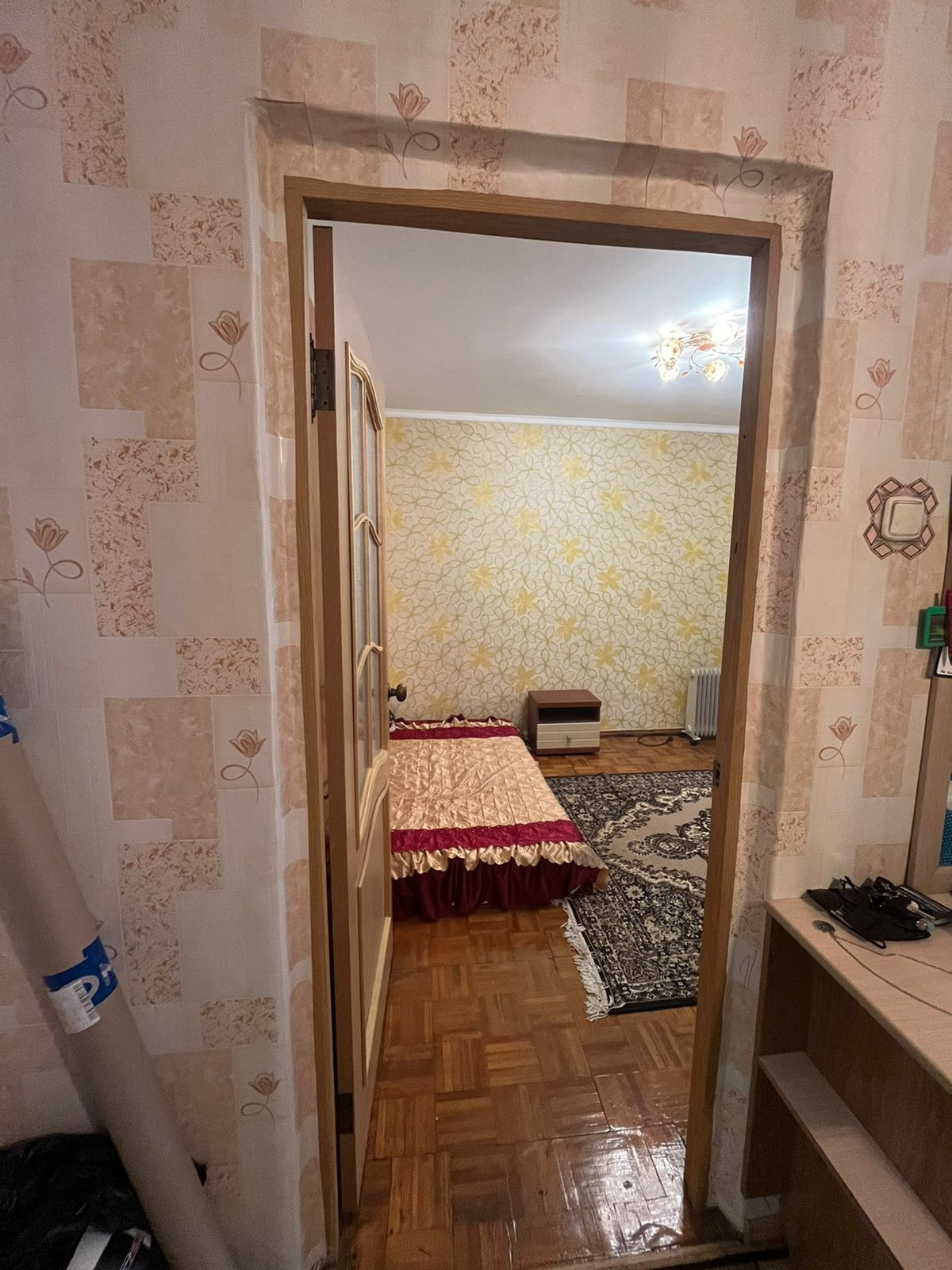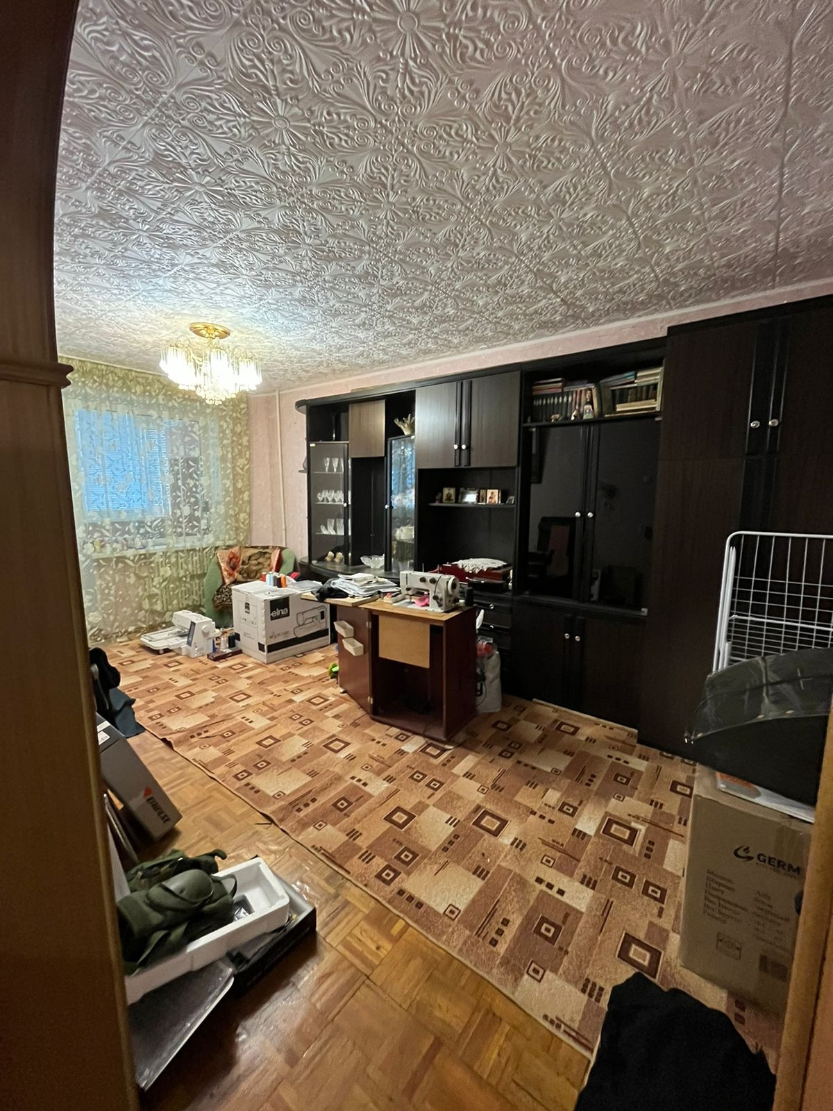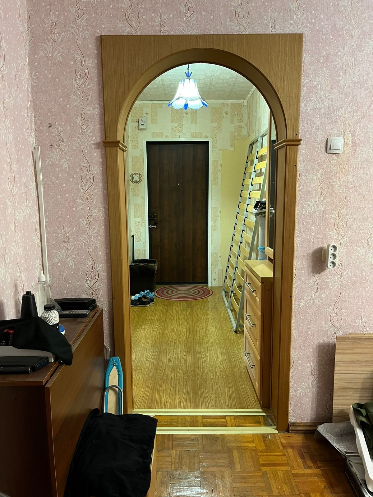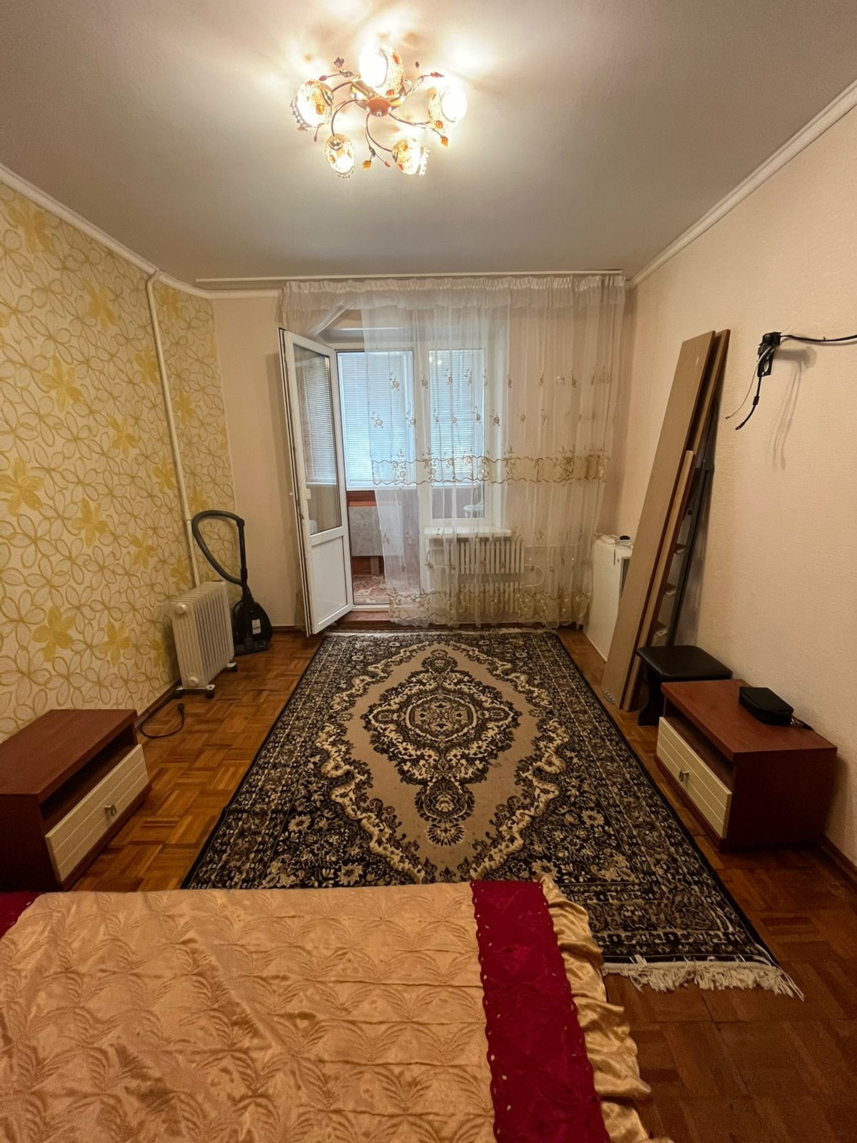 В кухонную зону проведён отдельный провод с большим запасом по нагрузке. В квартире остаётся кухонный гарнитур с уголком, стенка, компьютерный стол.