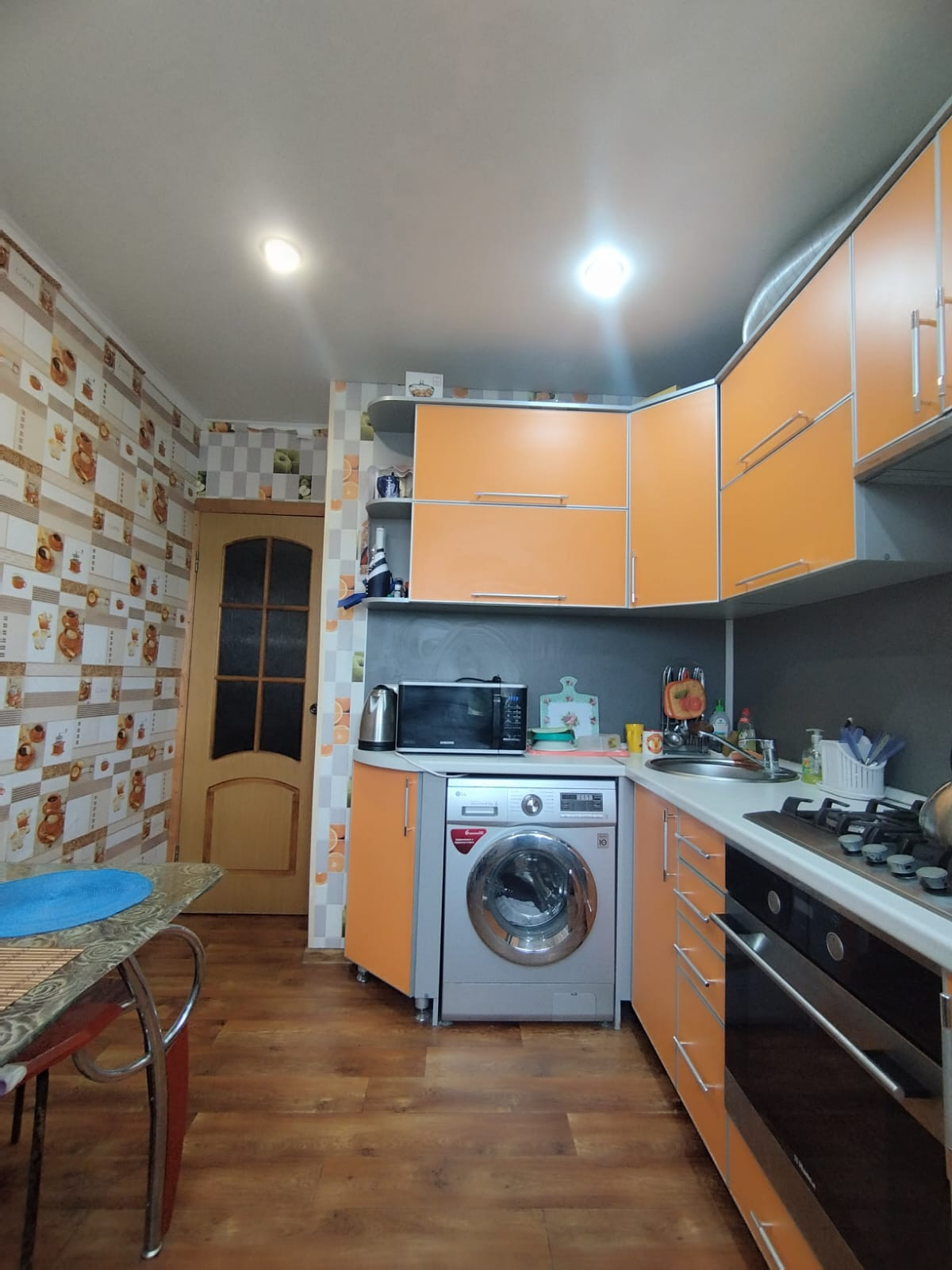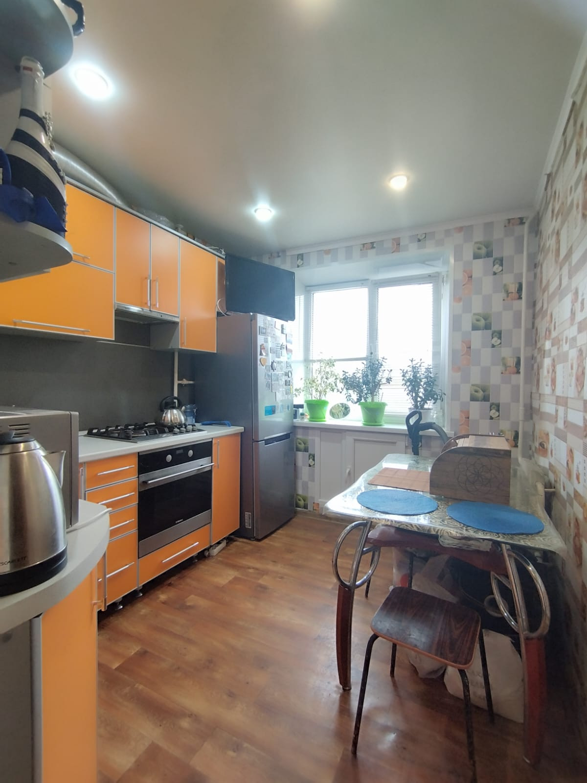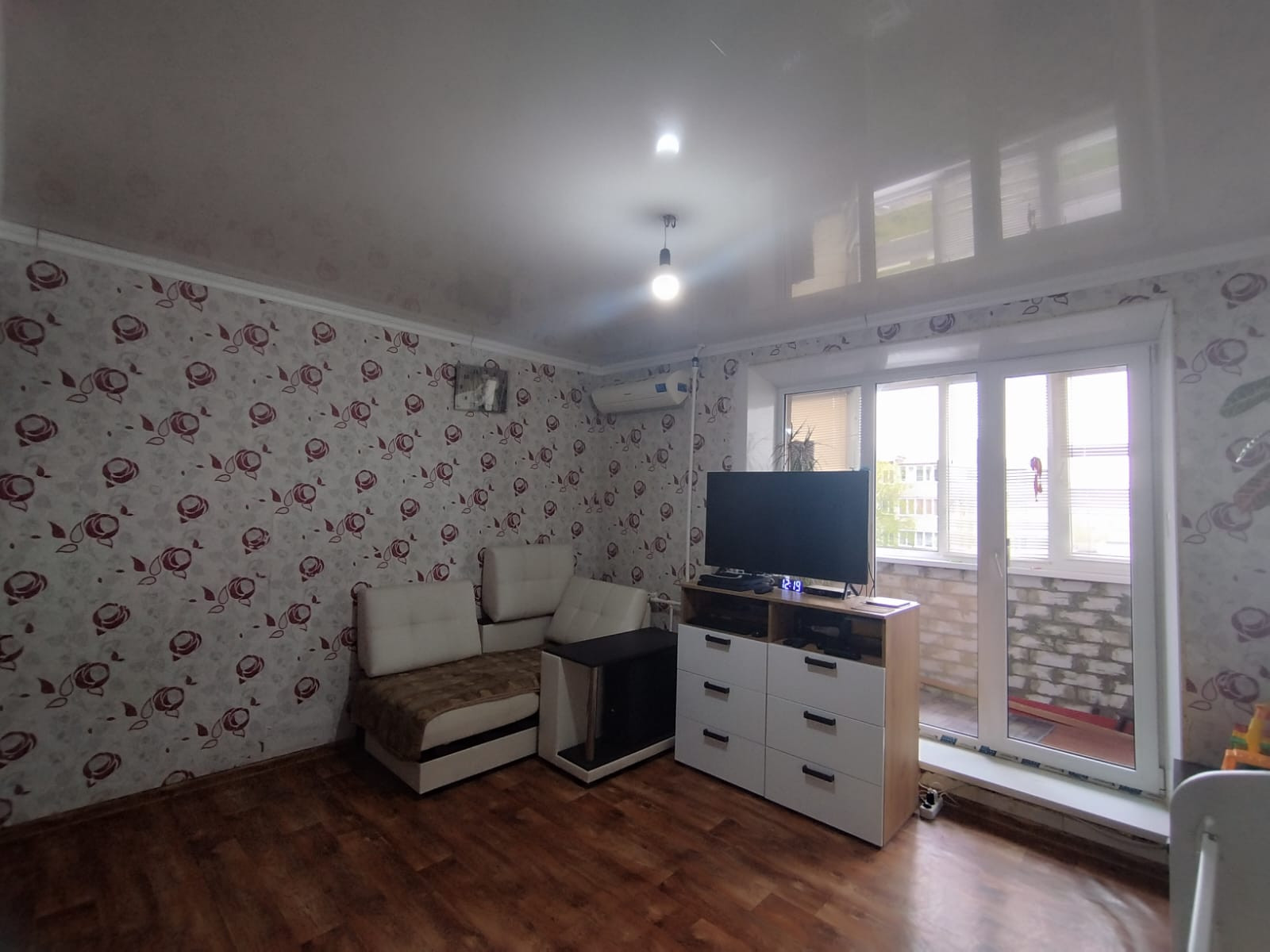 Квартира с нишей, натяжной потолок на кухне и в зале, кухня 7,5 м² окна и балкон ПВХ, балконный блок "панорамное остекление" за счёт него больше света в комнате.