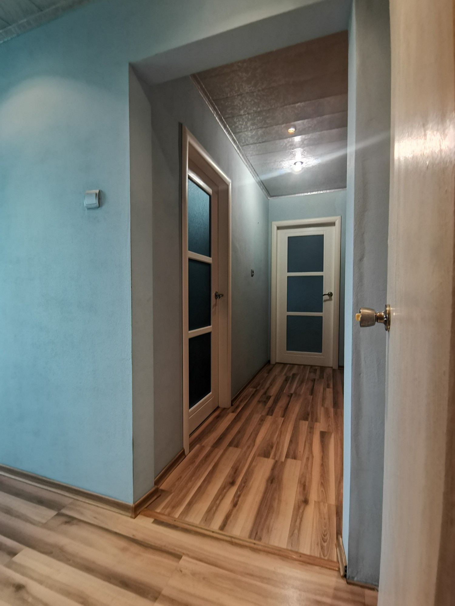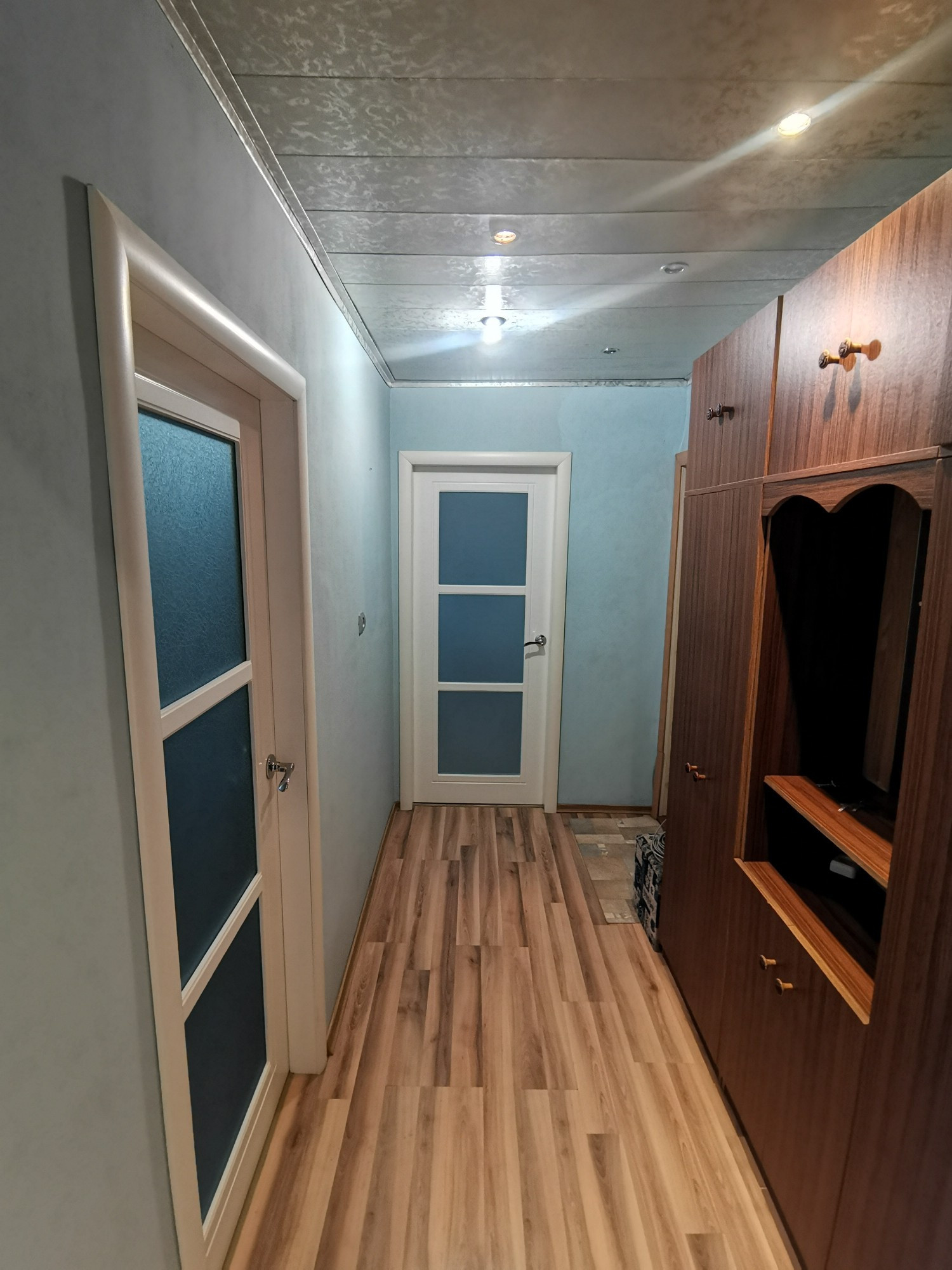 Потолки в кухне пластиковые с точечными светильниками, в коридоре - МДФ, в жилых комнатах - обои;