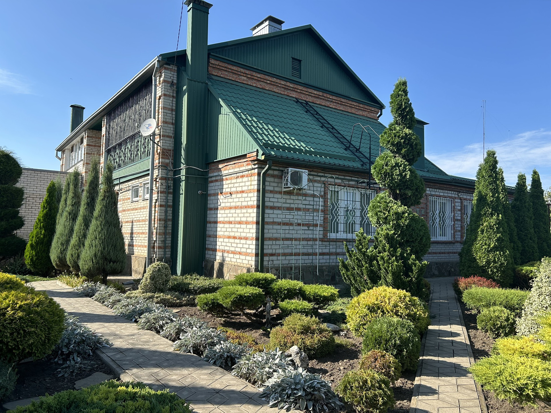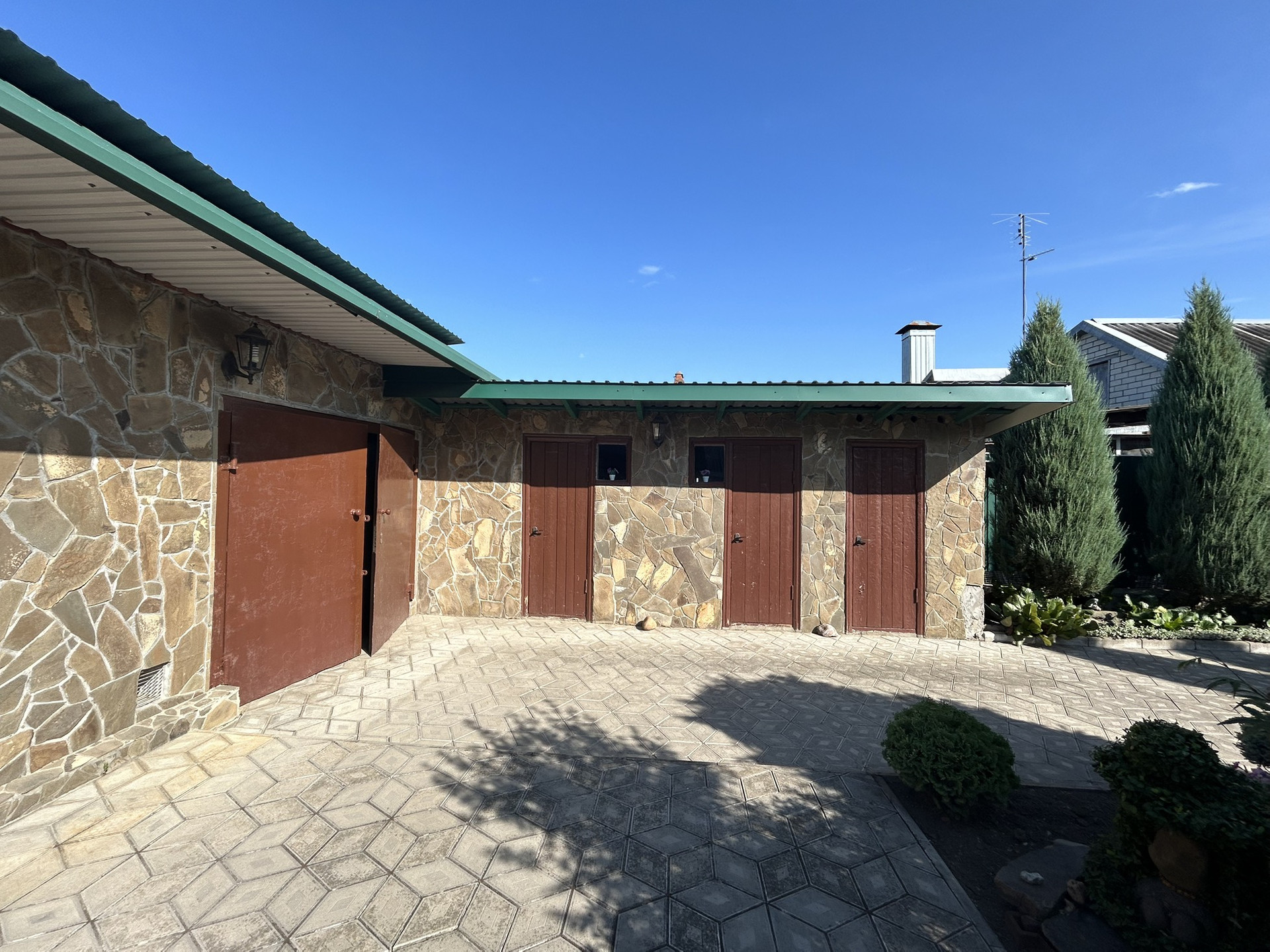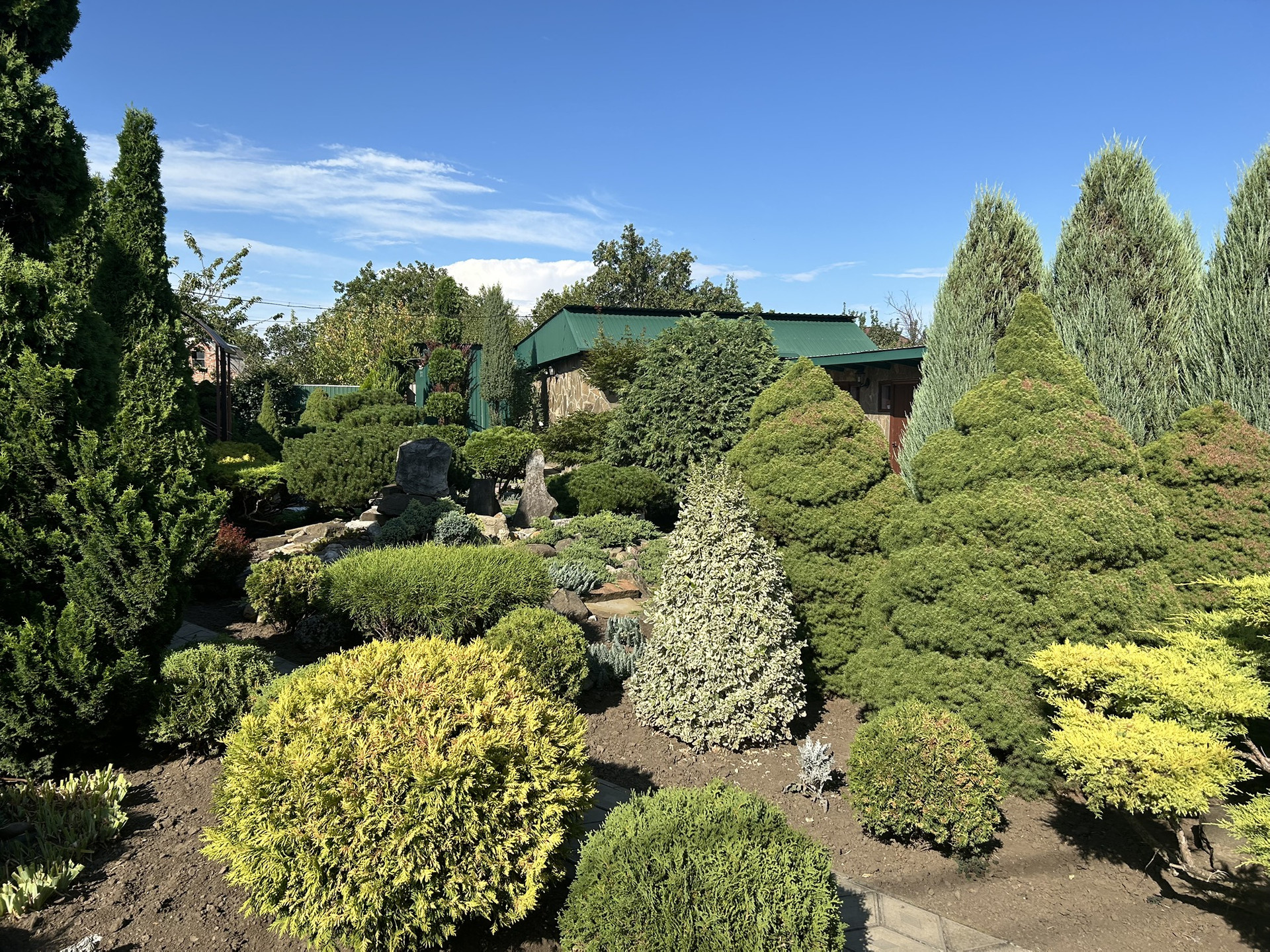 Во дворе Гараж с ямой на две машины, душ туалет, чудесный сад из хвойный деревьев и растений.
