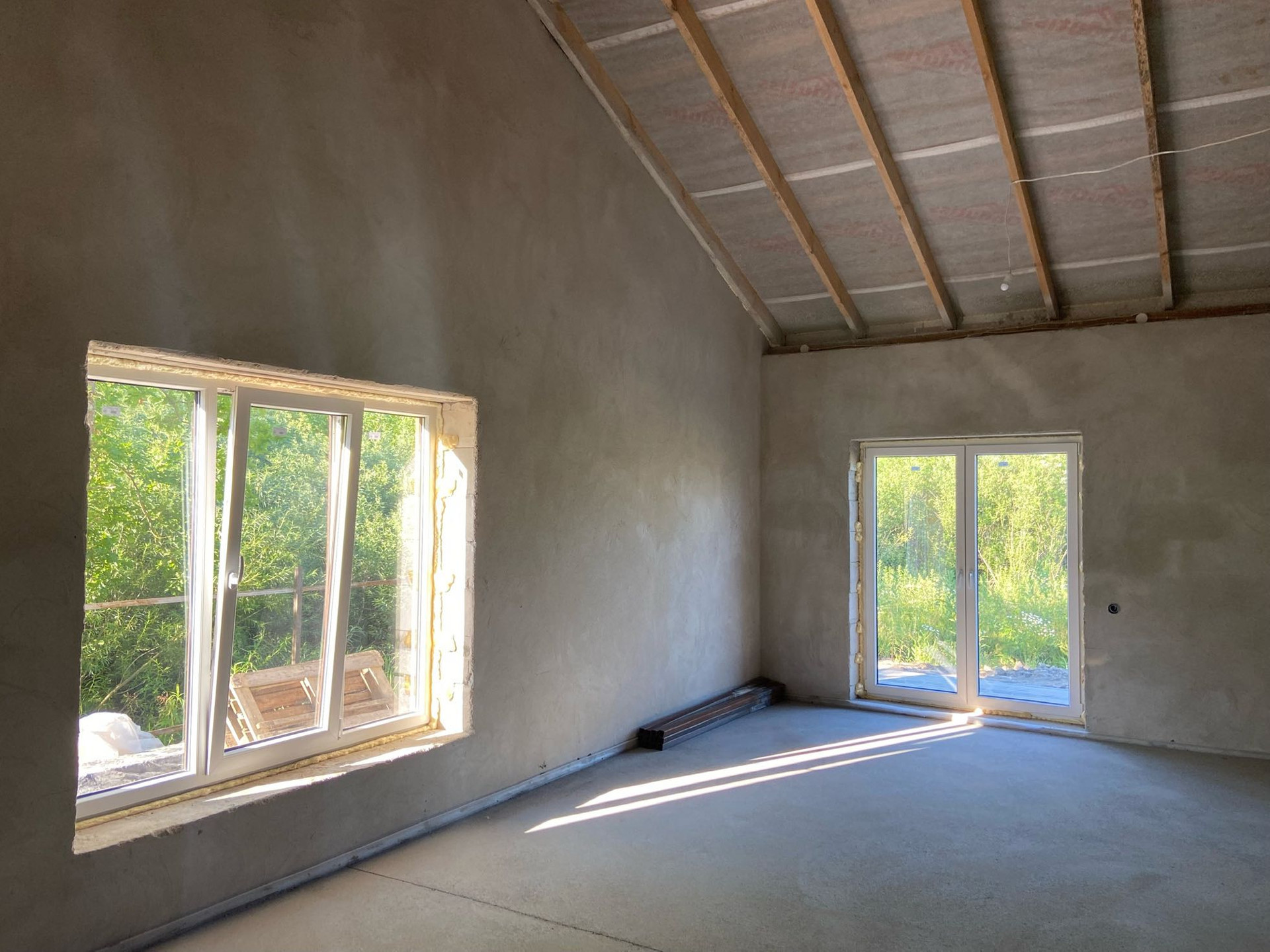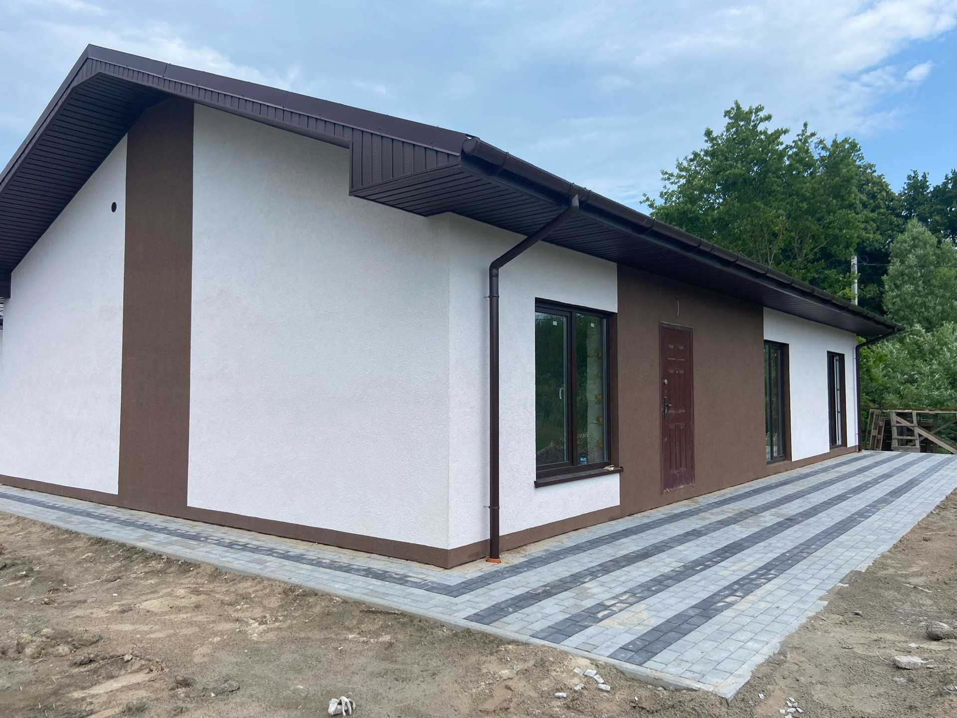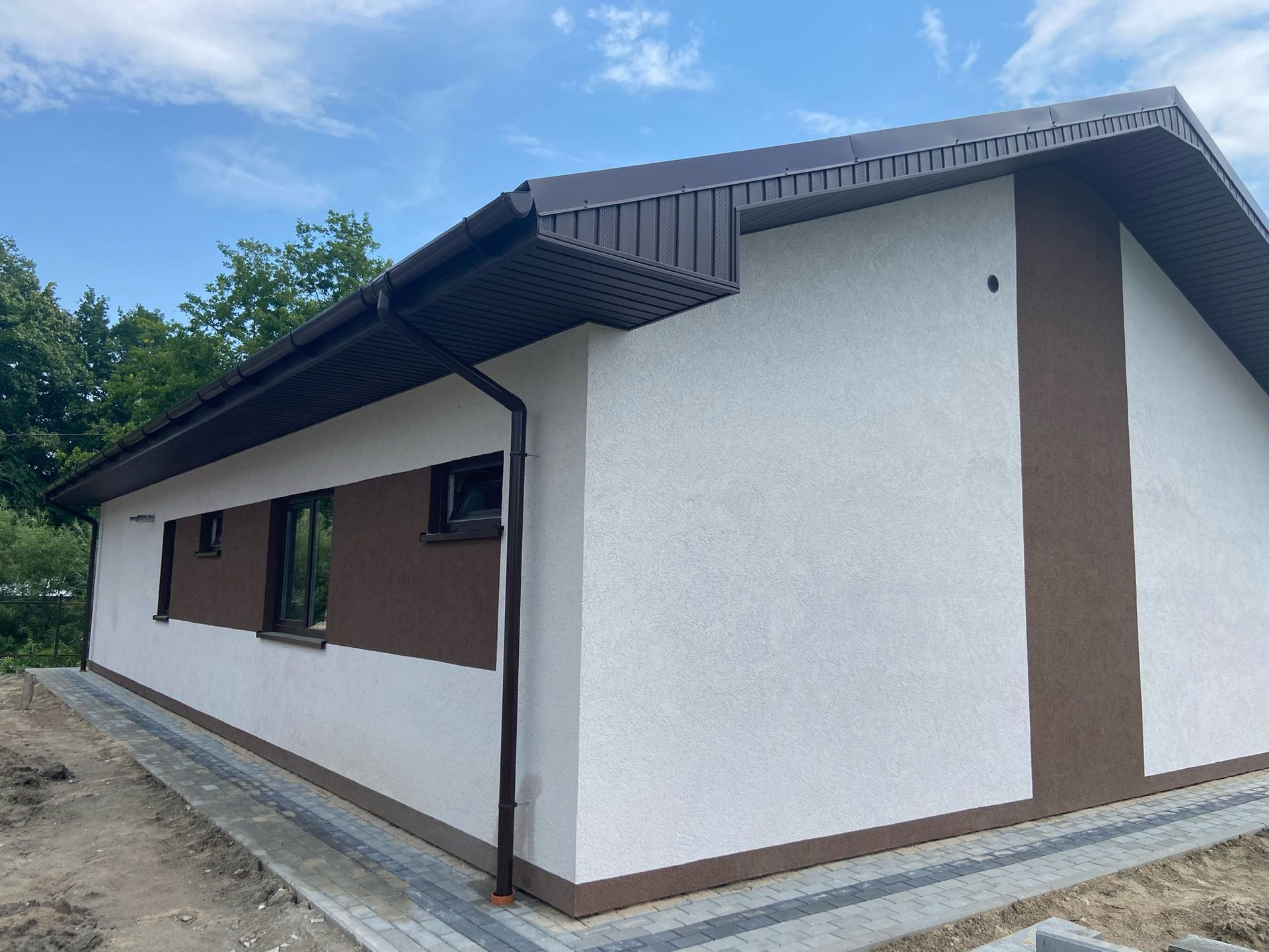 Фундамент лента + плита 20 см, стены газосиликатный блок толщина 40( см, кровля металлочерепица пр-во Финляндия, окна 7-камерный профиль.