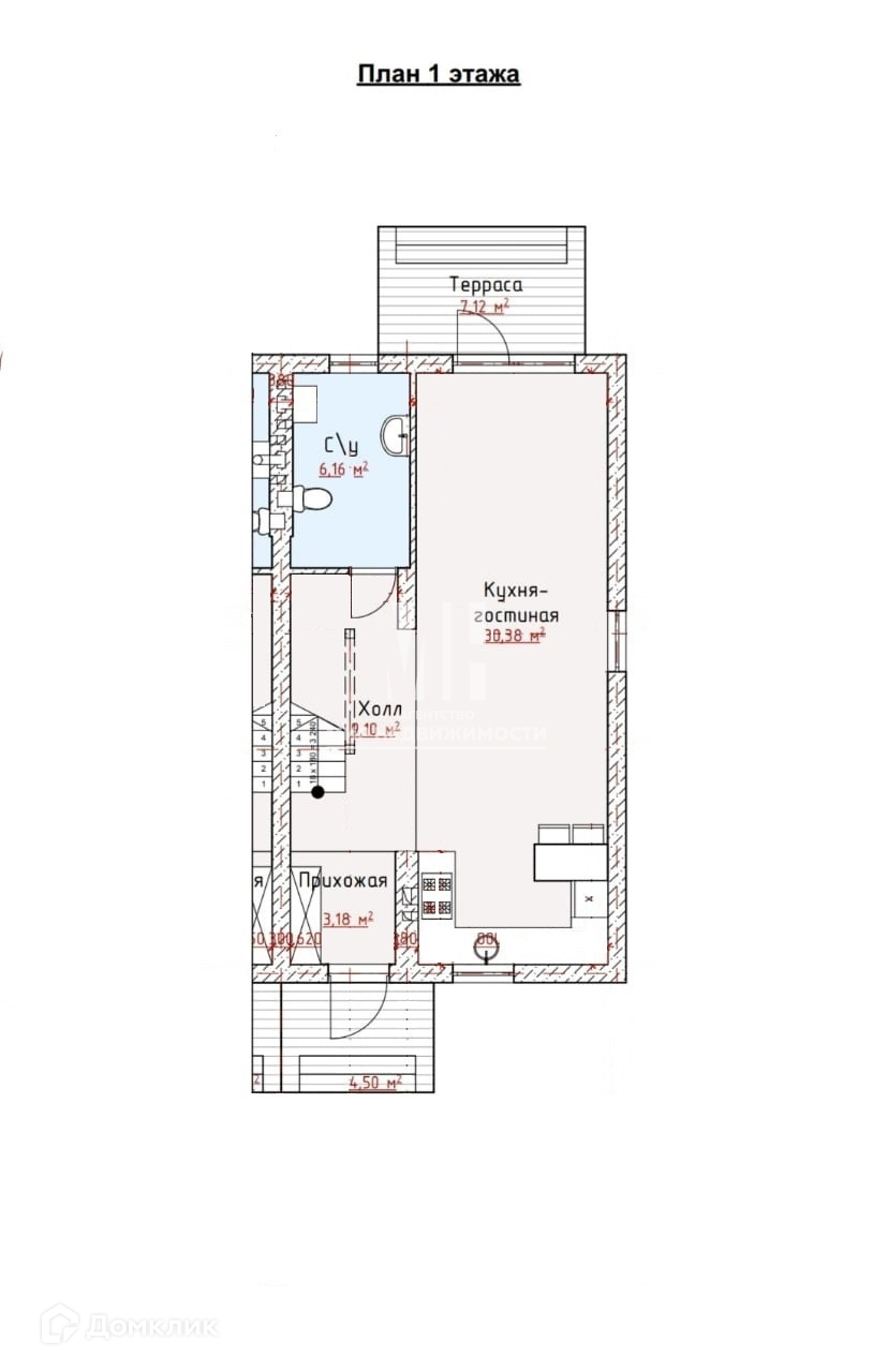 1 этаж : кухня-гостиная, санузел совмещённый - 6 кв.м., коридор - 9 кв.м., прихожая 3,1 кв.м., лестница.