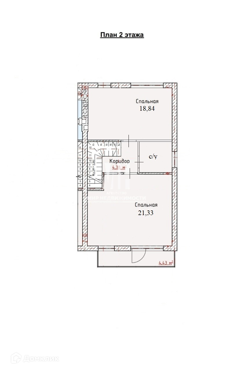 2 этаж : две комнаты 21,33+18,34 кв.м., санузел, коридор.