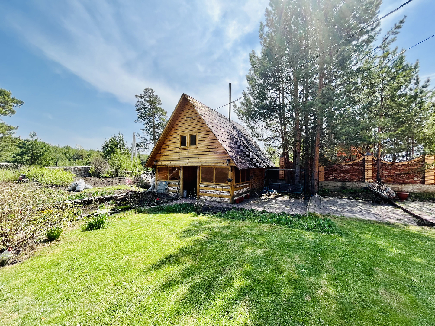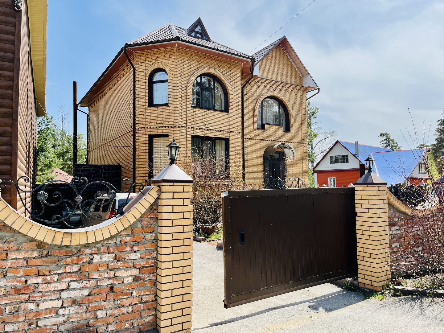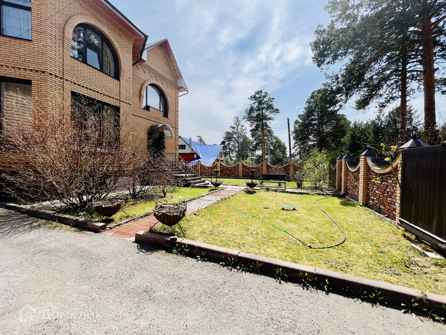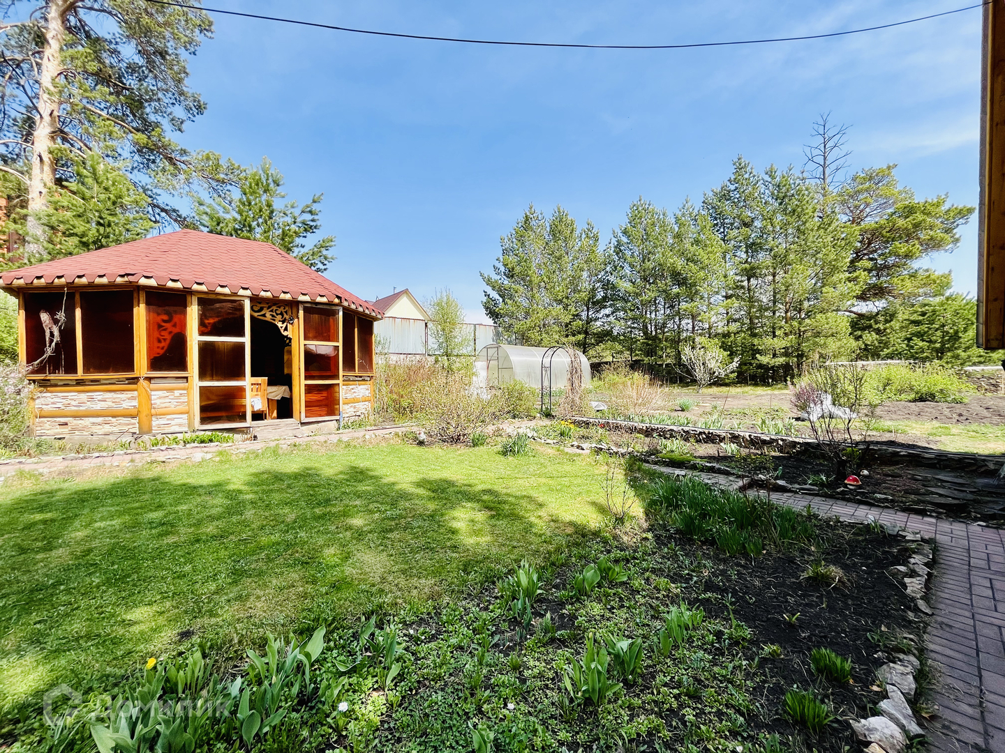 На территории: 2 мангальные зоны (в беседке с обеденным столом/при входе в сауну),  Гараж 12x6 с въездом для 3-х авто с электро-рольставнями.  Баня-сауна. Теплица из поликарбоната. Погреб.
