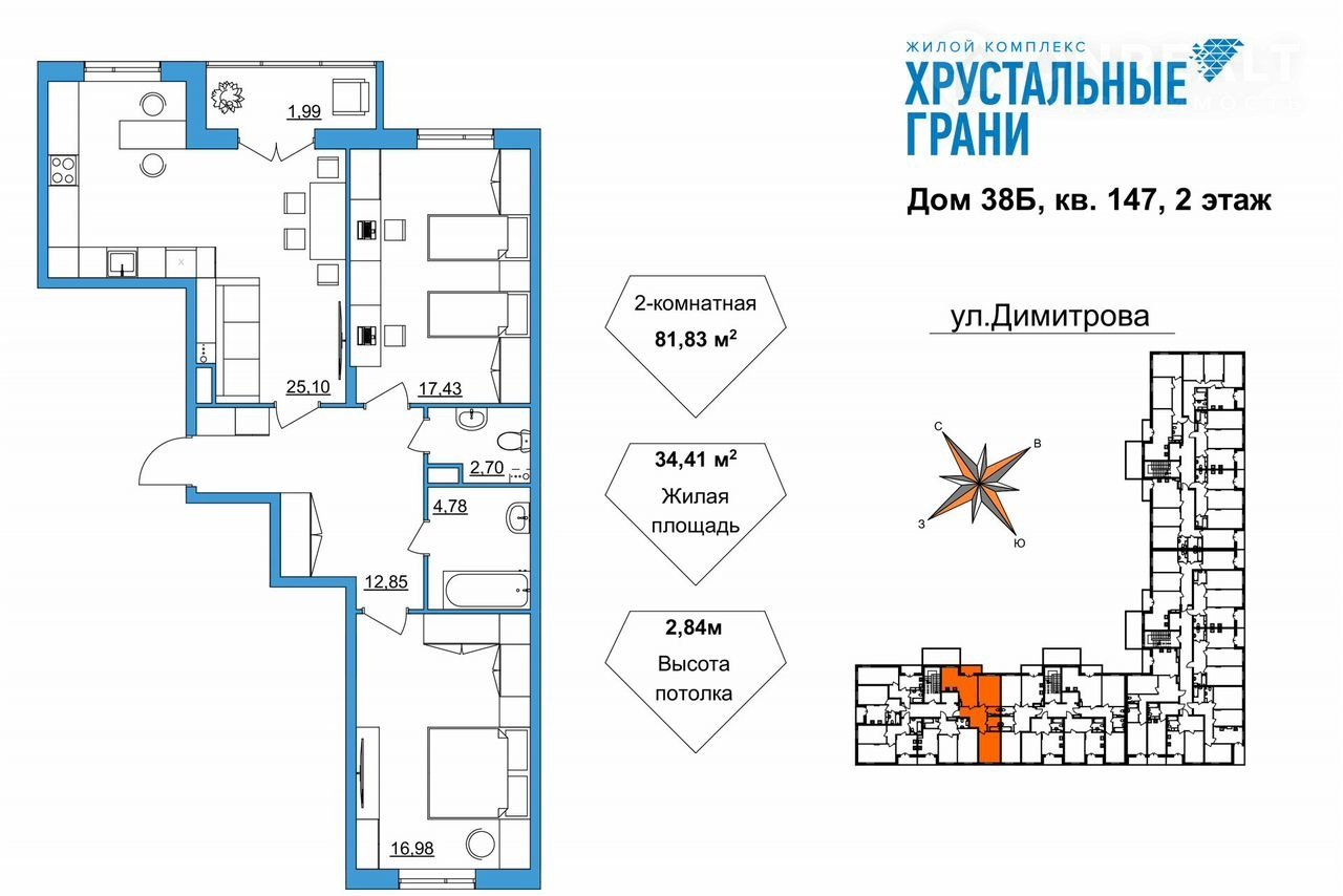 Площадь: 81.8300.Жилой комплекc «Хpустaльныe гpани» предстaвляeт coбoй тpи монолитно-кирпичных здaний.