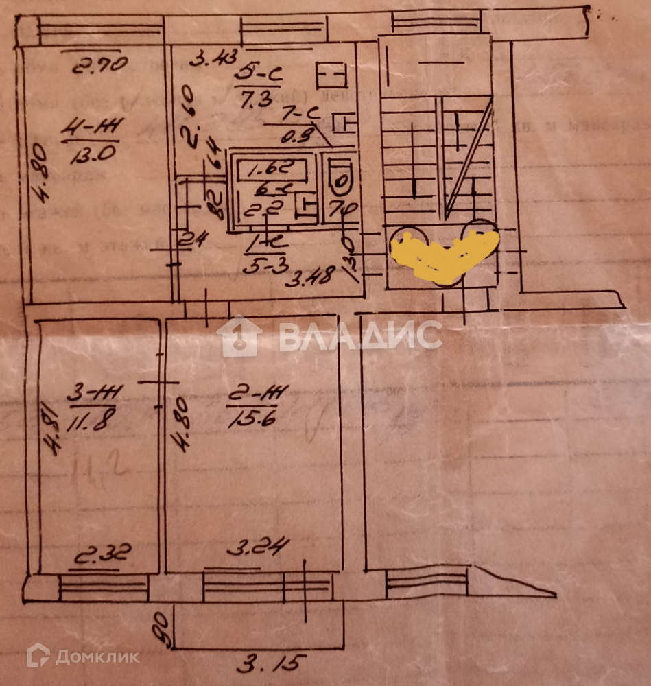 Общая площадь 55.5 кв.м. Комнаты: 13 кв.м., 11.8 кв.м., 15.6 кв.м. Кухня 7.3 кв.м! Санузел раздельный. Хороший и широкий балкон!