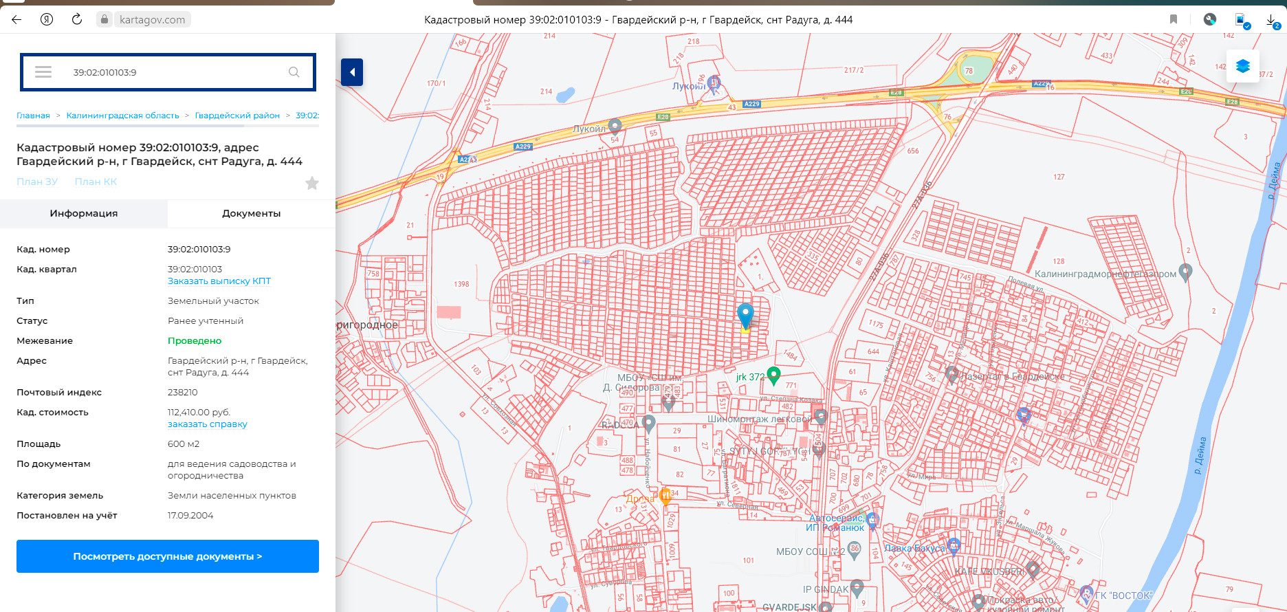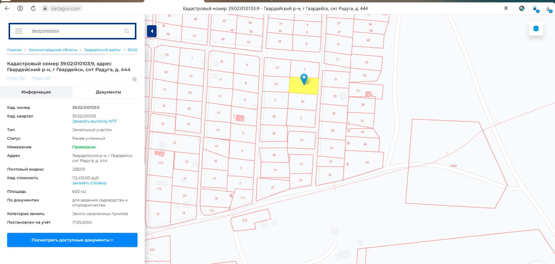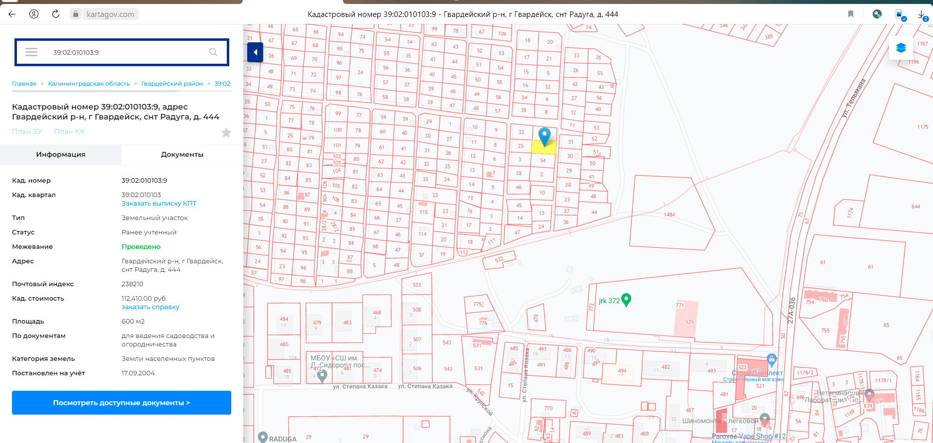 Кадастровый номер 39:02:010103:9, адрес Гвардейский р-н, г Гвардейск, снт Радуга, д. 444