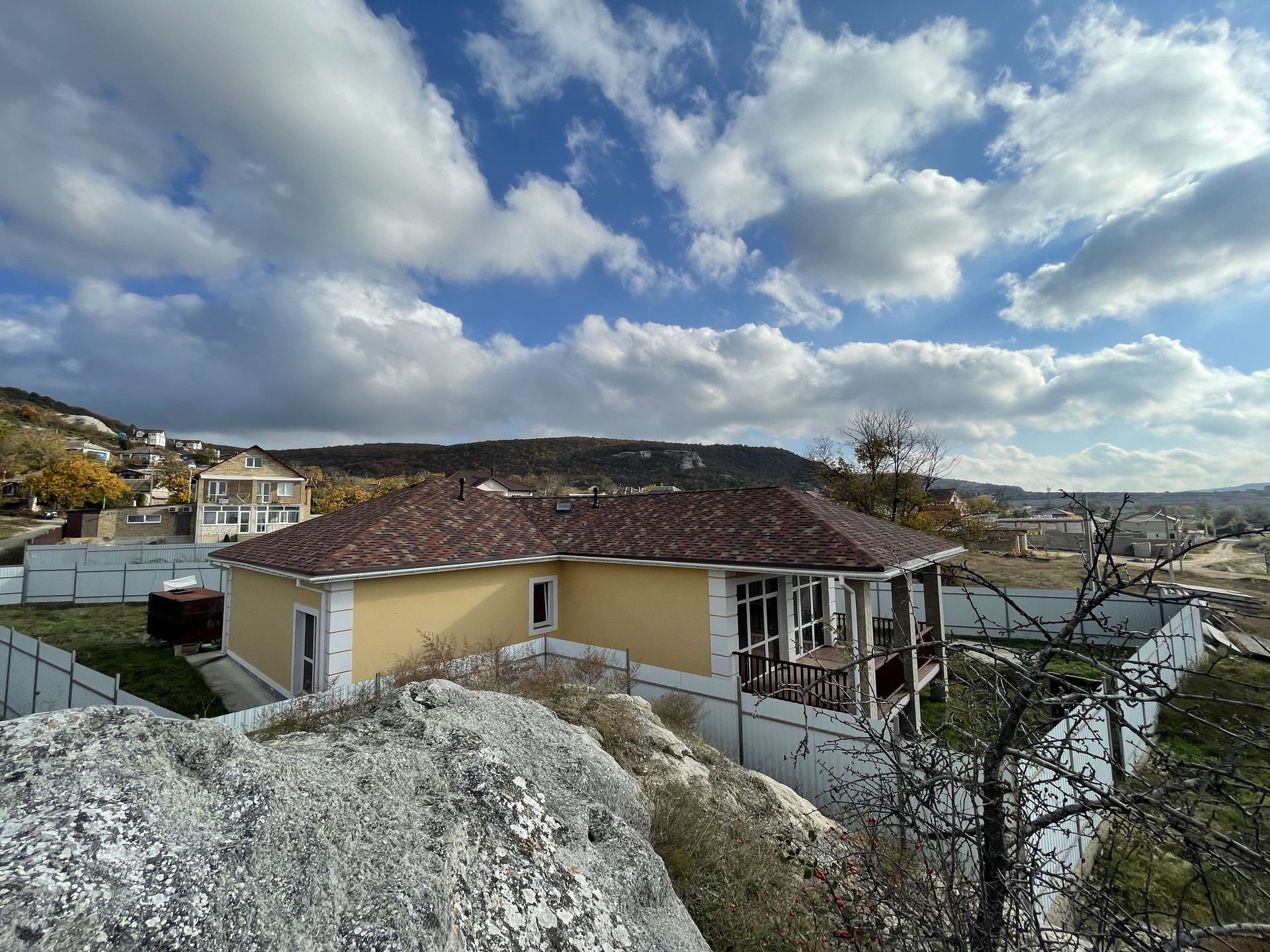 Дом одноэтажный, планировка идеальна- просторная кухня-гостиная 40 м кв с панорамным остеклением (с двух сторон) и выходом на просторную видовую веранду – 20 м кв, с видом на бухту Инкерман, три спальни, две спальни по 20м кв, одна 13 м кв, одна из больших спален с прилегающим большим сан узлом , всего в доме 2 сан узла.