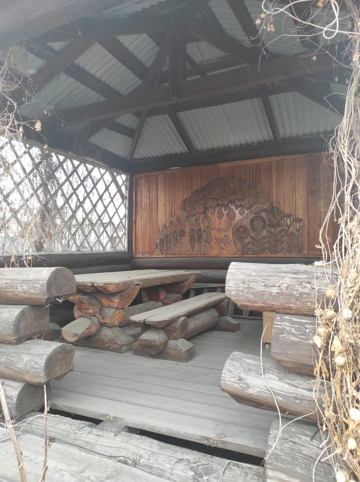 Беседка из рубленного бревна с роскошным столом и скамейками из бревна.
