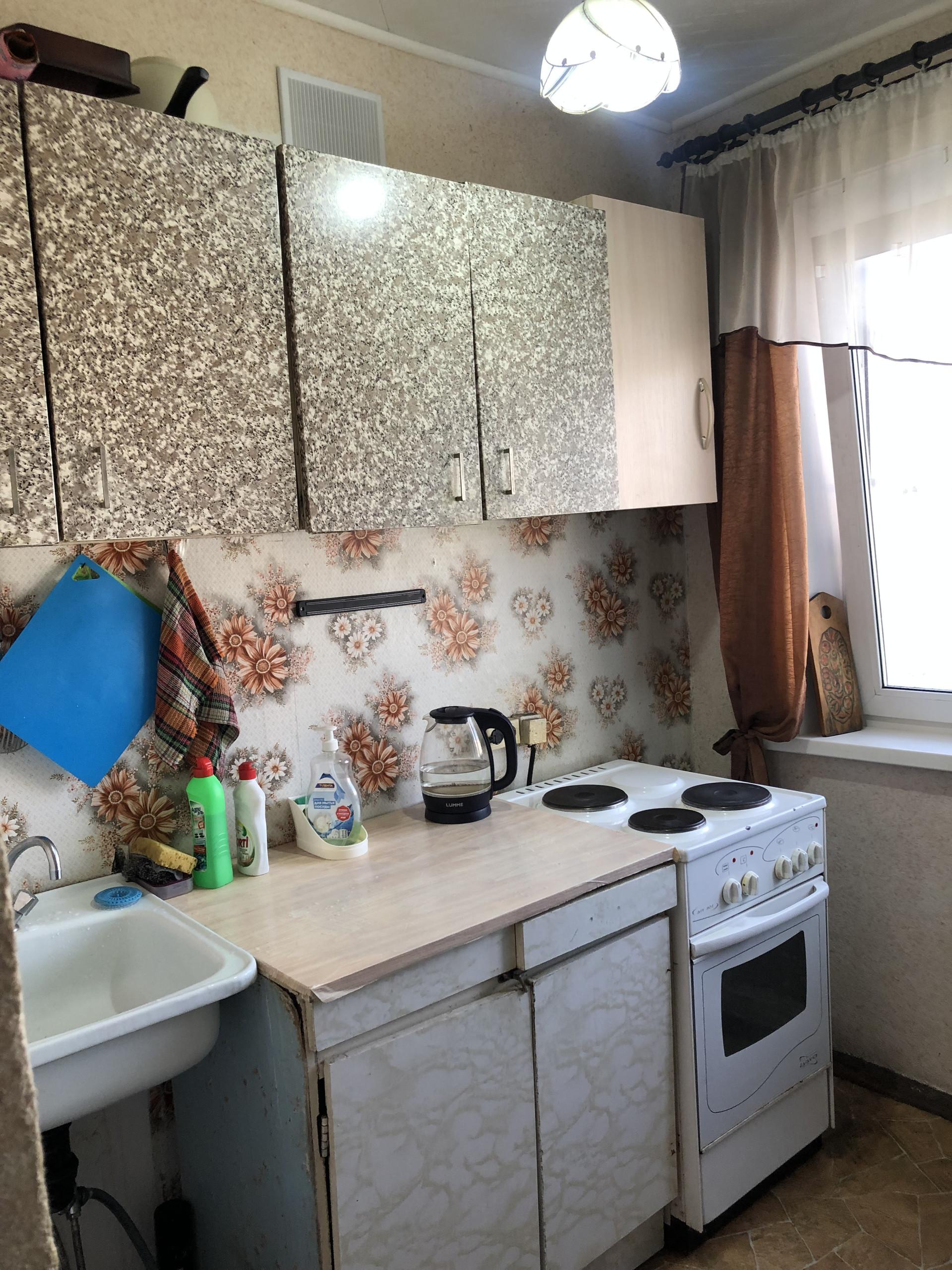О комнате: солнечная, уютная, на кухне отдельно установлена личная мебель, плита, холодильник и стиральная машина. Соседи тихие, практически не бывает дома. На полу в комнате линолеум,потолки натяжные.
