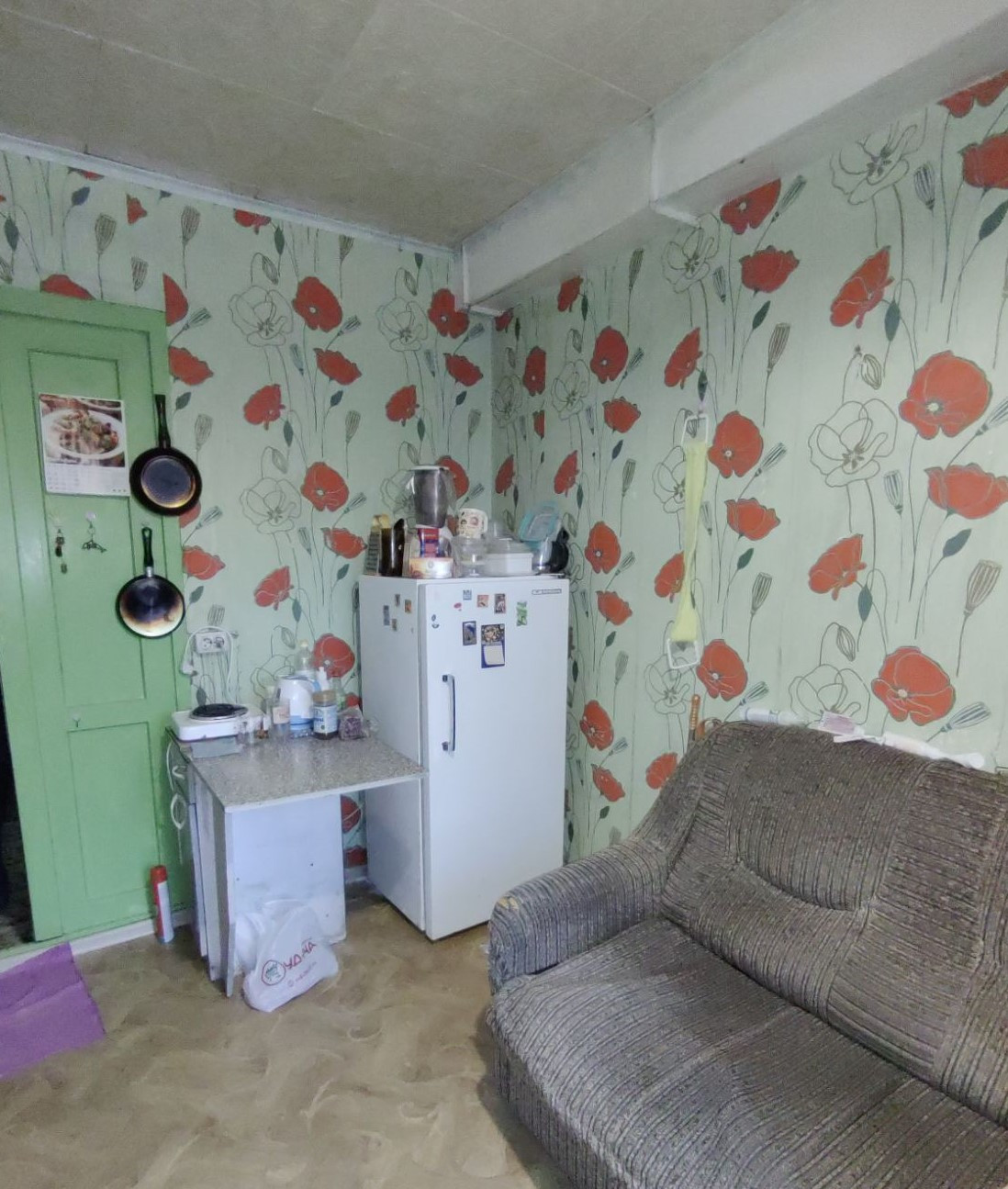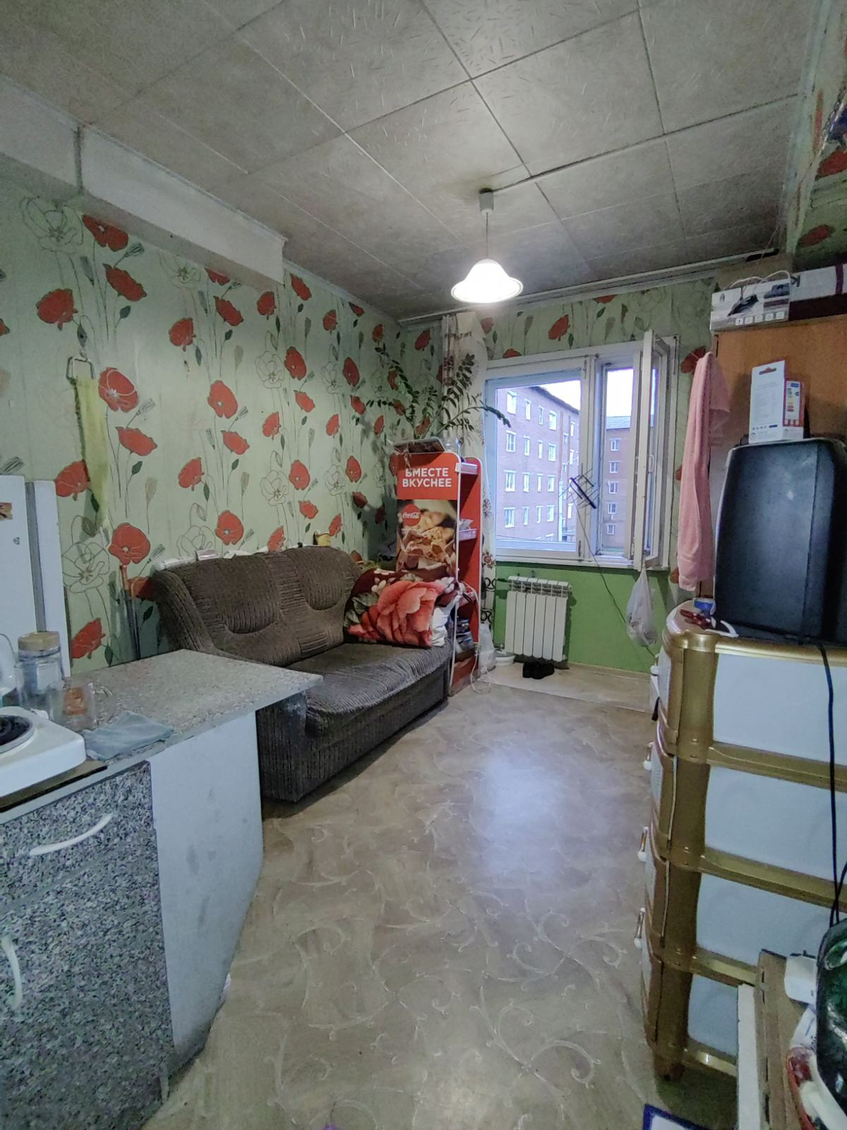 Комната площадью 9,5 кв.м, квадратной формы. Требуется косметический ремонт, в данный момент проживает квартирант. По соседству проживает приличный одинокий мужчина.