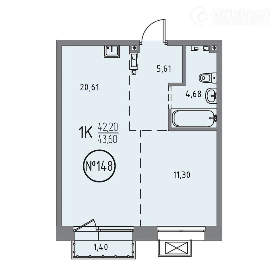 Общая площадь 43.6 м2