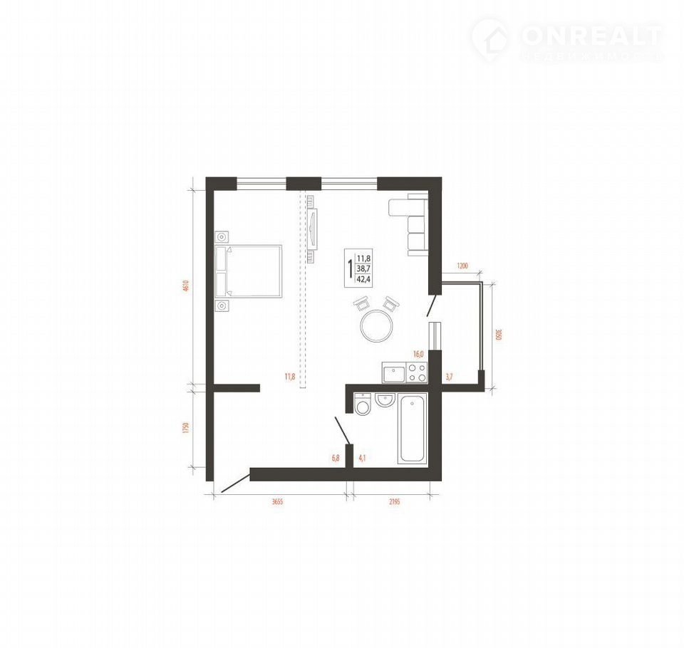 Общая площадь 42.4 м2