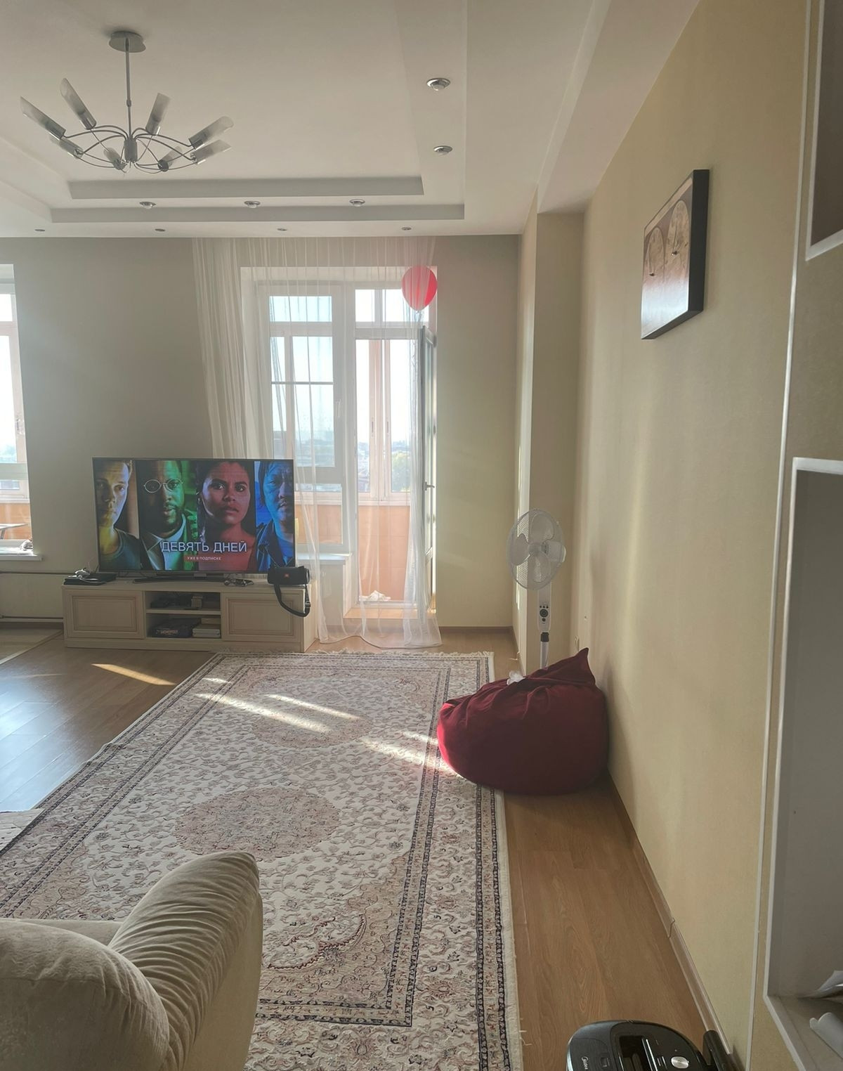 Площадь без учета застекленного балкона 77.1 кв. м., 2 комнаты отдельные, кухня-студия.