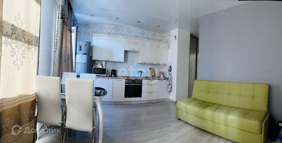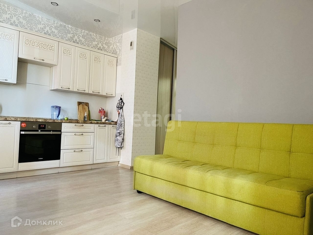 Квартира находится на 5 этаже. Окна выходят на солнечную сторону. Совмещённая кухня-гостиная с отделённой спальной зоной, большой ванной комнатой, хорошим ремонтом.