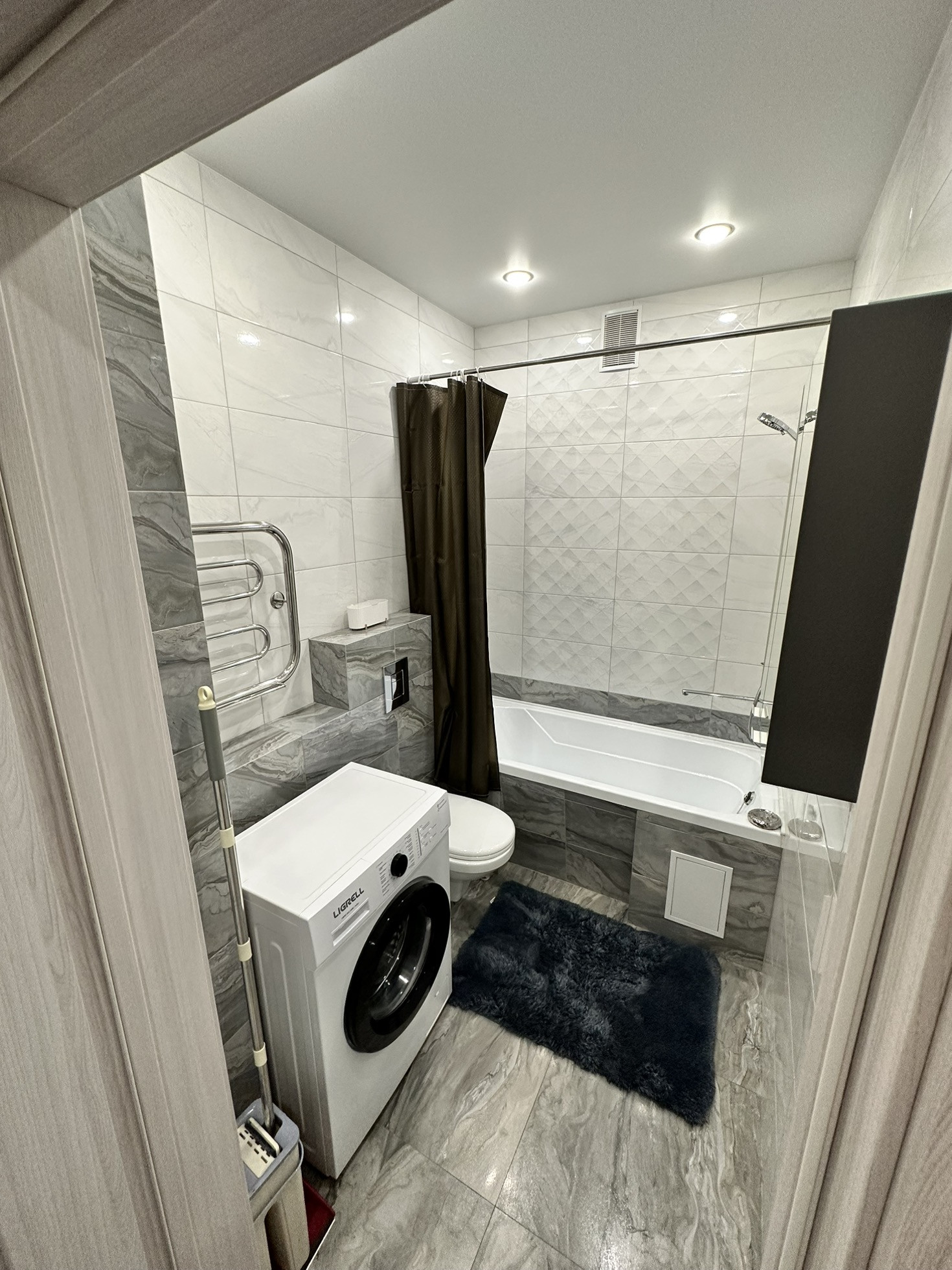 · Санузел совмещен, отделан керамической плиткой kerama marazzi, натяжной потолок