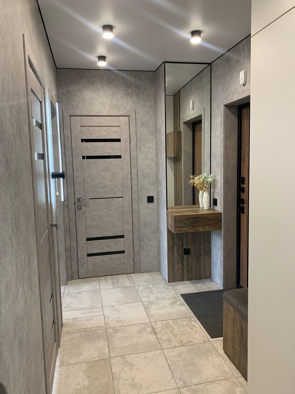 в отличном состоянии, всё делали для себя из качественных материалов, в комнатах ламинат, в ванной керамогранит, в коридоре плитка, поменяна входная дверь, установлены межкомнатные двери, стены в квартире окрашены, везде натяжной потолок кроме одной спальни,