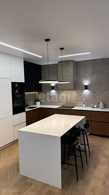 Кухня с островом, выполнена в современном стиле,с каменной столешницей и интегрированной в фартук вытяжкой. Полностью оснащена встраиваемой техникой: