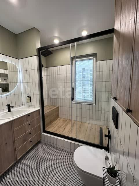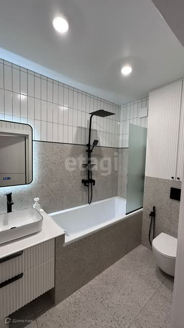 Второй санузел с ванной, подвесным унитазом, гигиеническим душем, местами хранения, зеркалом с функцией подогрева, часами и температурой.