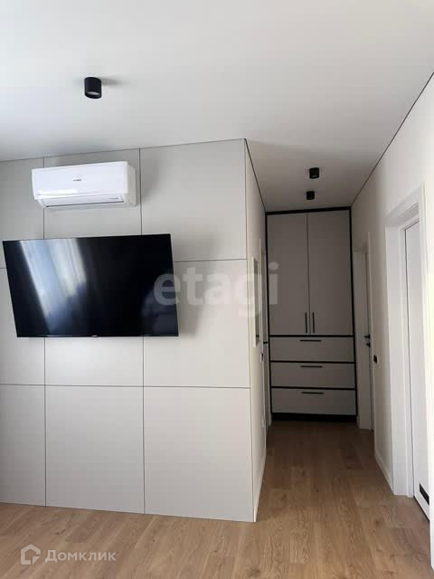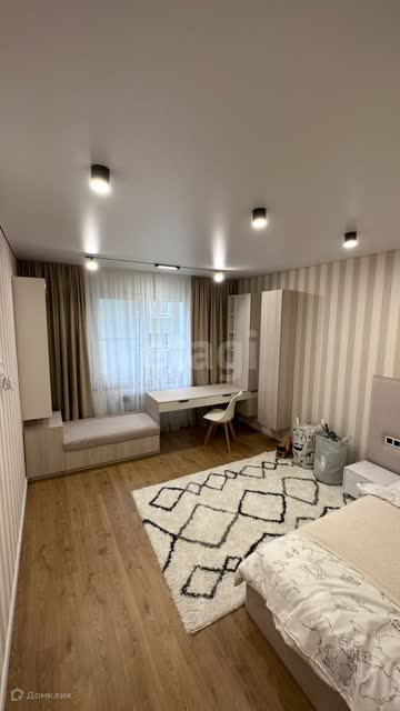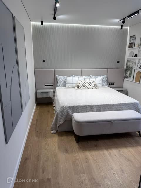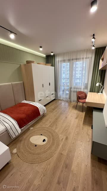 В спальне кровать 180*200 с мягким изголовьем, тв с функцией Smart и 4k, кондиционер, разные сценарии освещения.