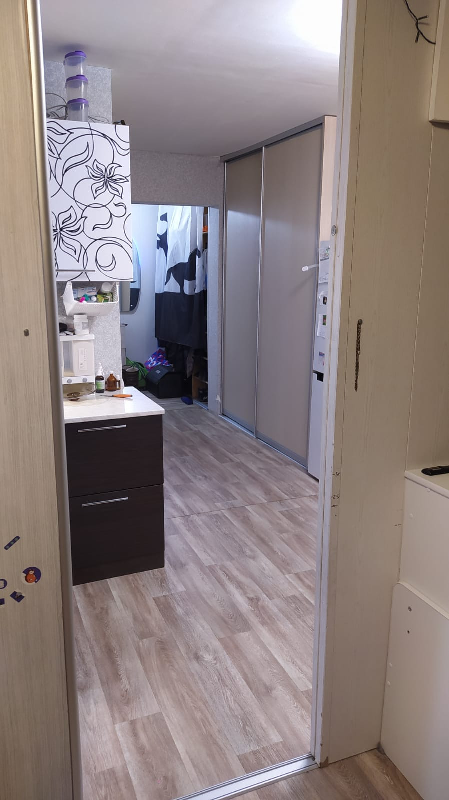 В связи с отъездом продается уютная студия, в которой жилая зона отделена от кухни функциональной перегородкой (с хранилищем предметов) с раздвижными дверями.