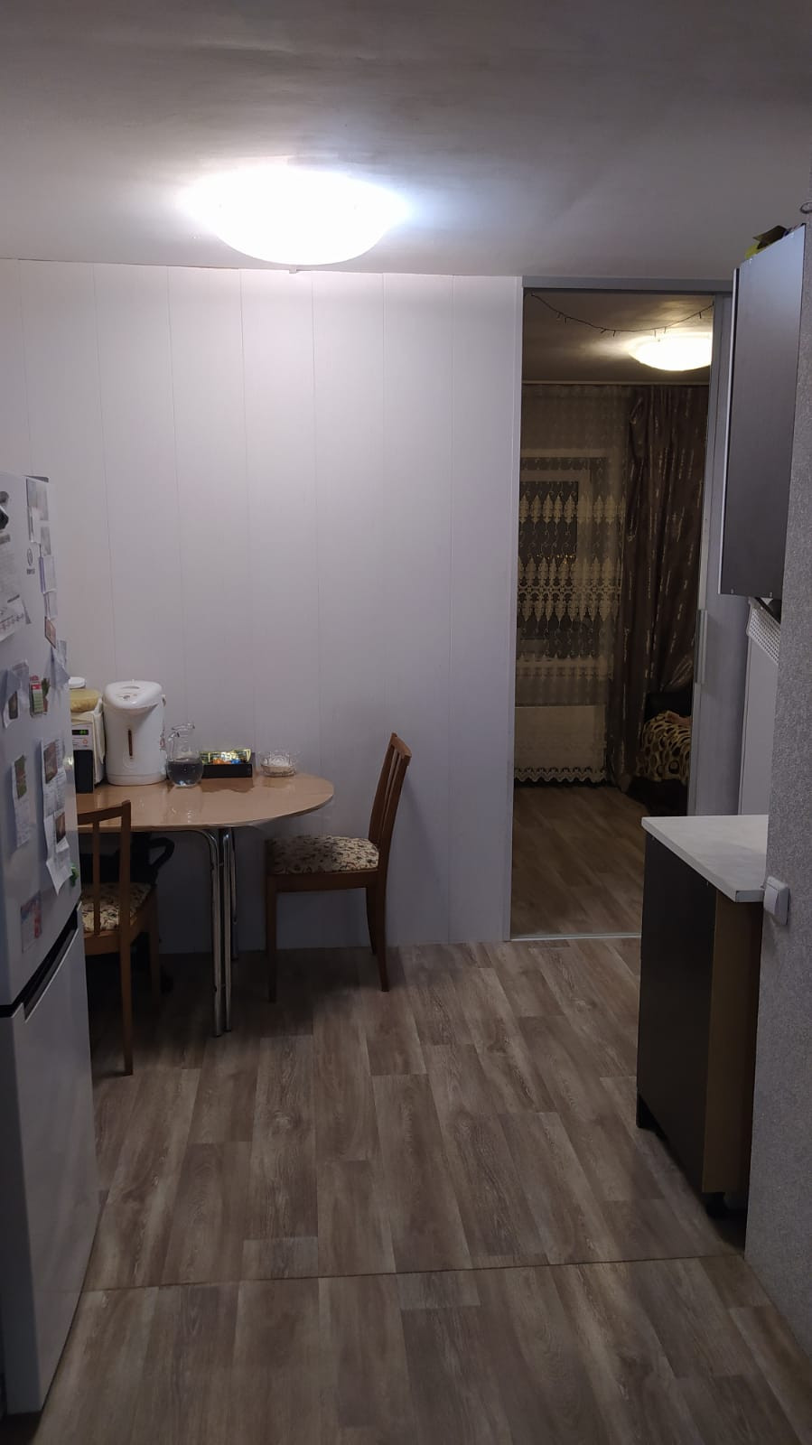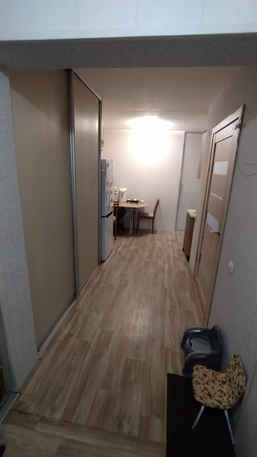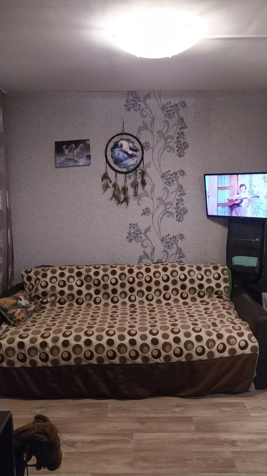 На полу линолеум, под которым еще есть деревянный настил, что идеально для здоровья суставов, стены идеально ровные, в обоях.