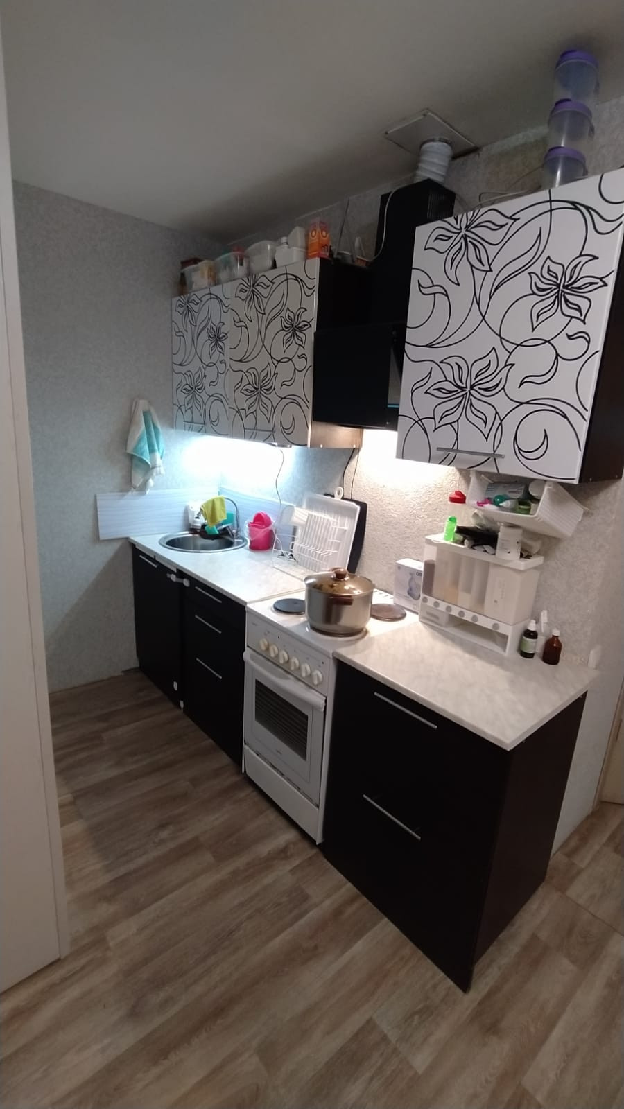 Все необходимое для жизни есть: остается мебель (диван, кухонный гарнитур, стол), три шкафа, один из которых шкаф-купе. Отдельно обсудим наличие бытовой техники (предварительно остается по умолчанию - вытяжка, плита с духовкой и чайник).