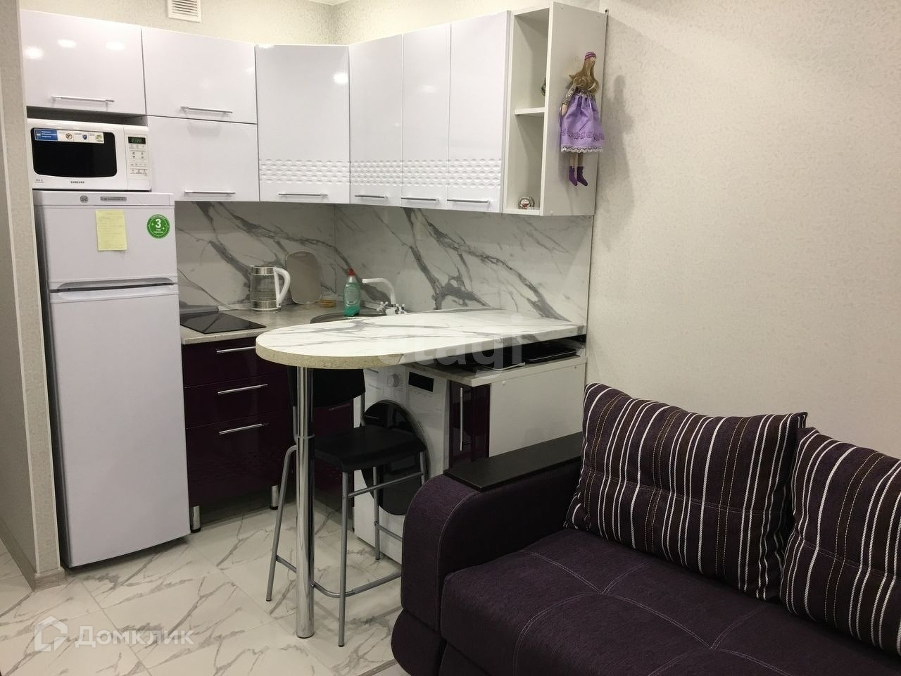 В зоне кухни и санузла теплый пол, барная стойка и барные стулья, дверь в санузел стоит с влагозащитой.