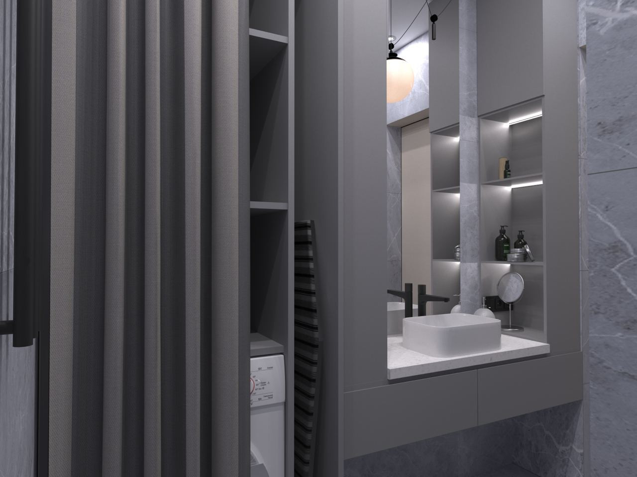 - В квартире организованы зона постирочной и хозяйственного хранения.