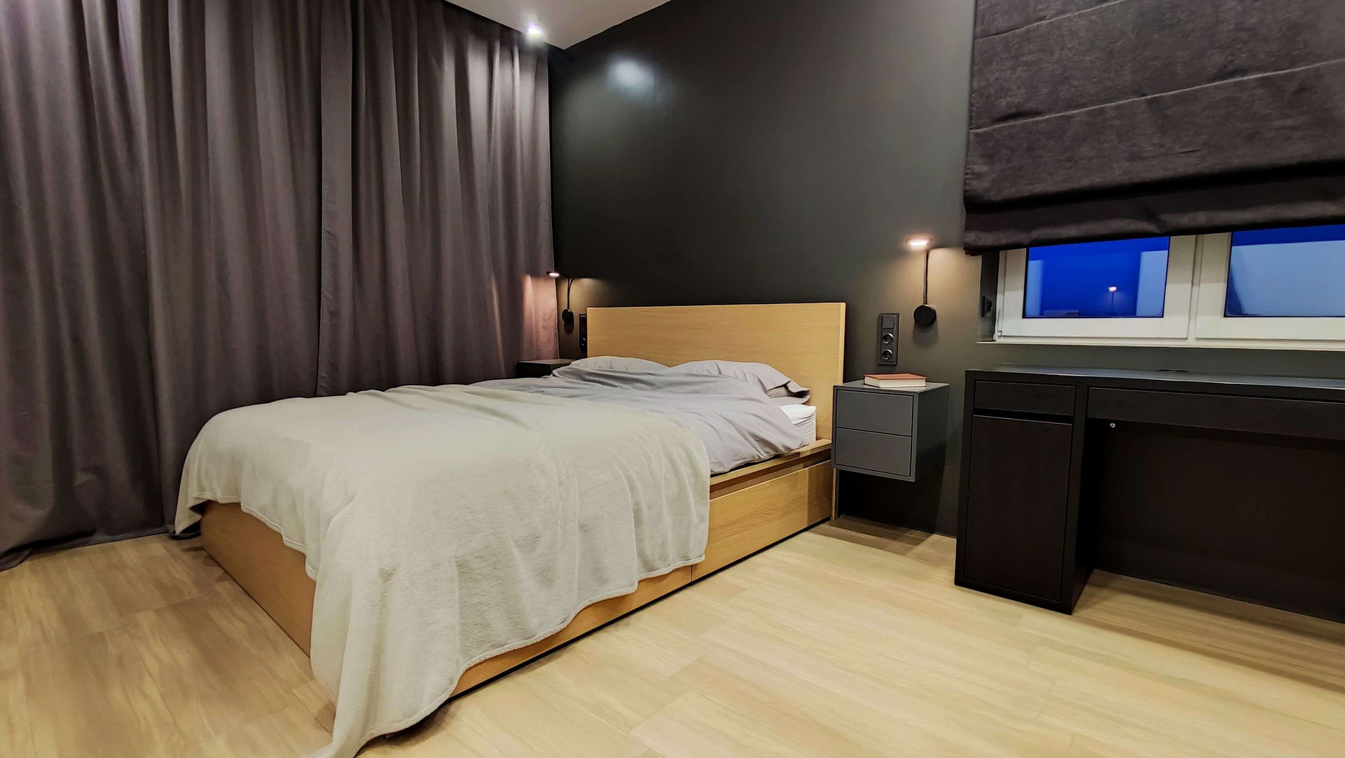 Уютная спальня - 17 м2, из окон которой также открывается отличный вид на Ангару. Вместительная гардеробная комната.