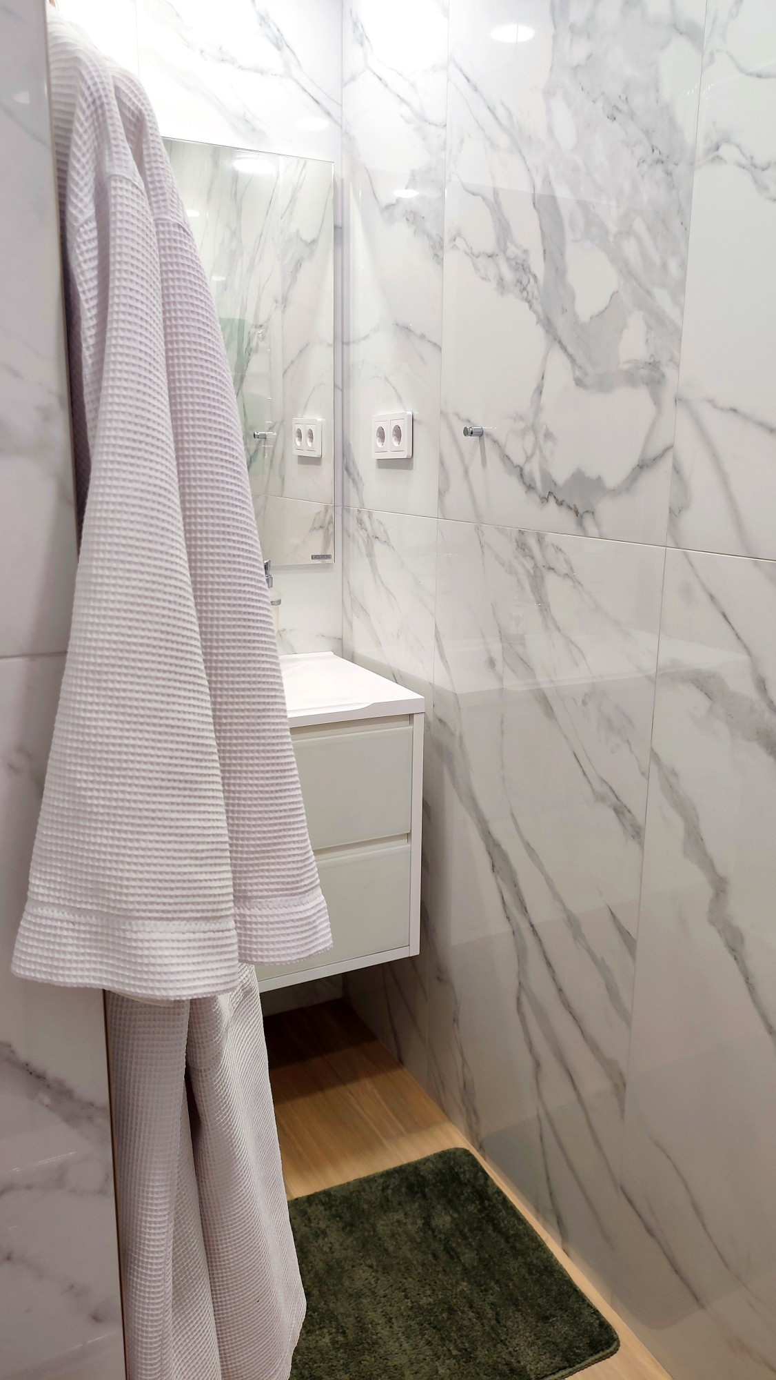В квартире выполнен отличный ремонт с использованием качественных материалов. По всей квартире уложен керамогранит единым контуром, в каждой комнате тёплые полы.