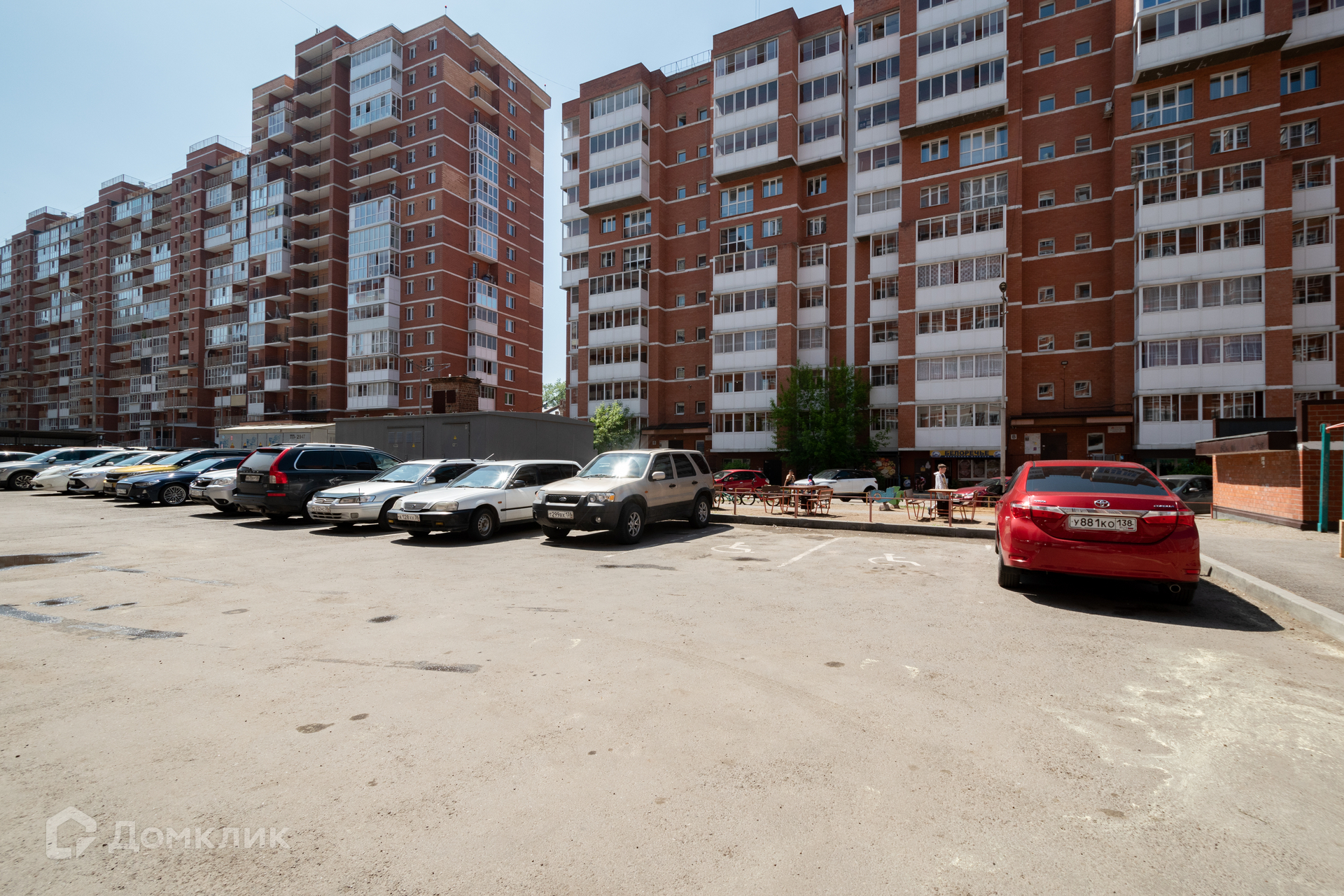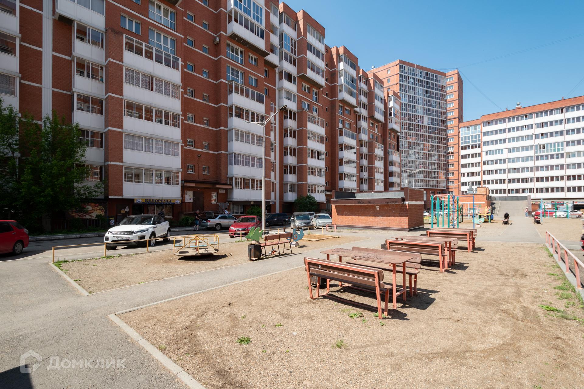 Детская спортивная площадка для прогулок и отдыха во дворе, открытая парковка.